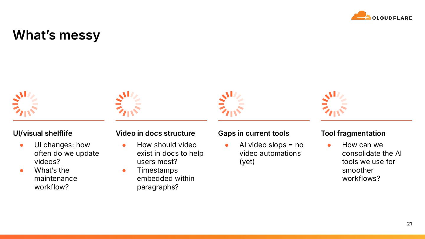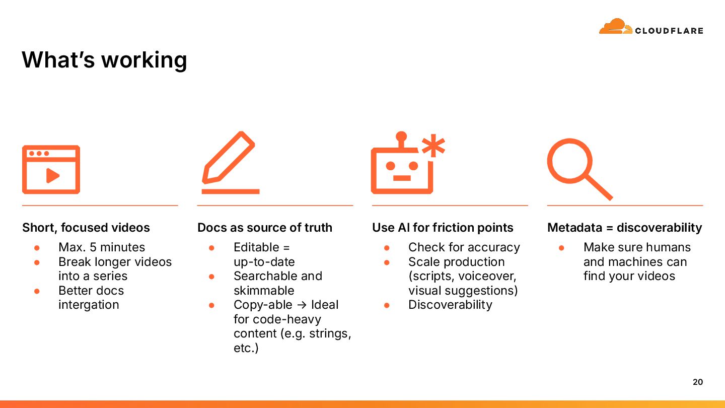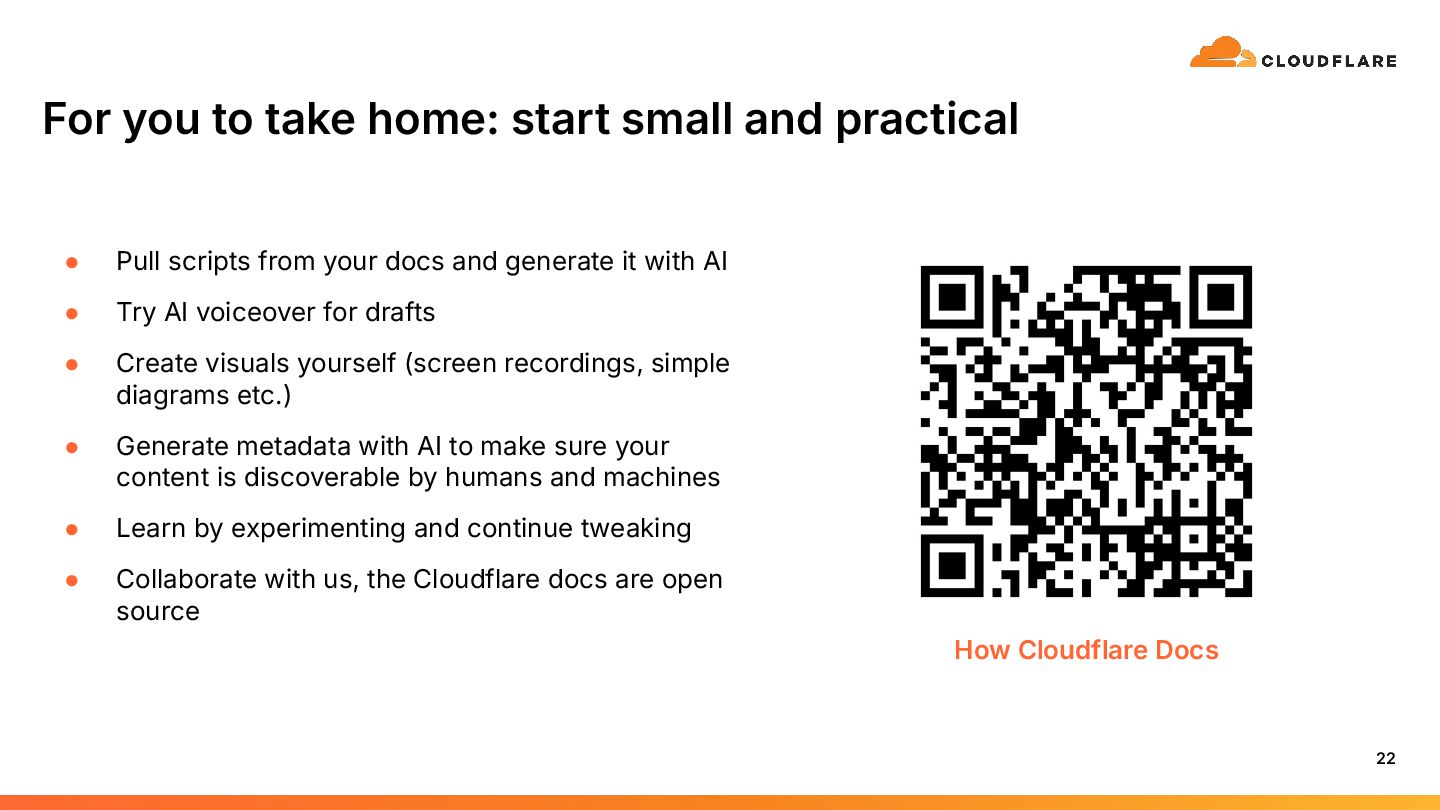 This presentation goes behind the scenes of Cloudflare’s Product Content Experience (PCX) team to share a practical, "messy" story of innovation. Learn how to bridge the gap between technical writing and video production using AI-driven workflows that maintain accuracy while scaling reach.