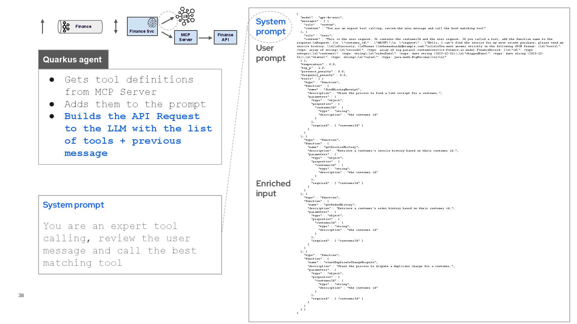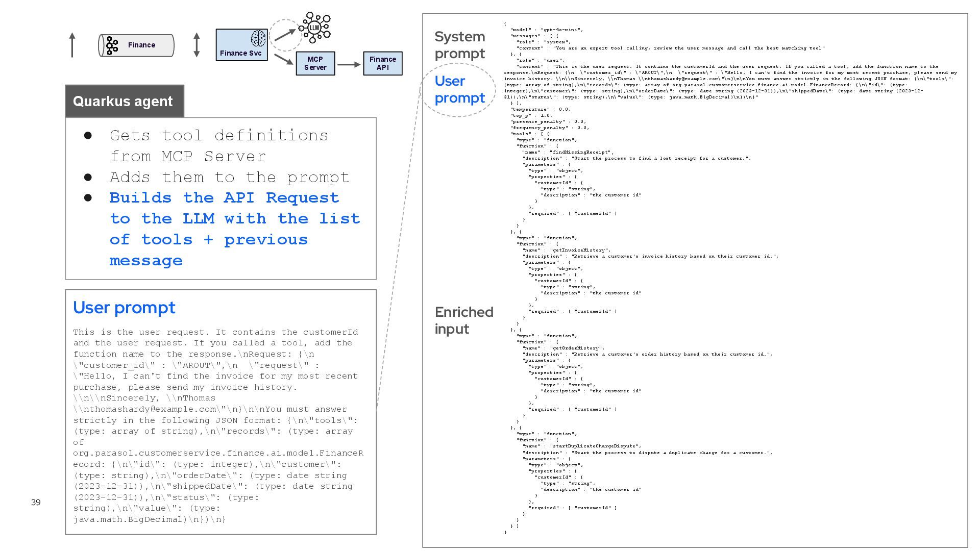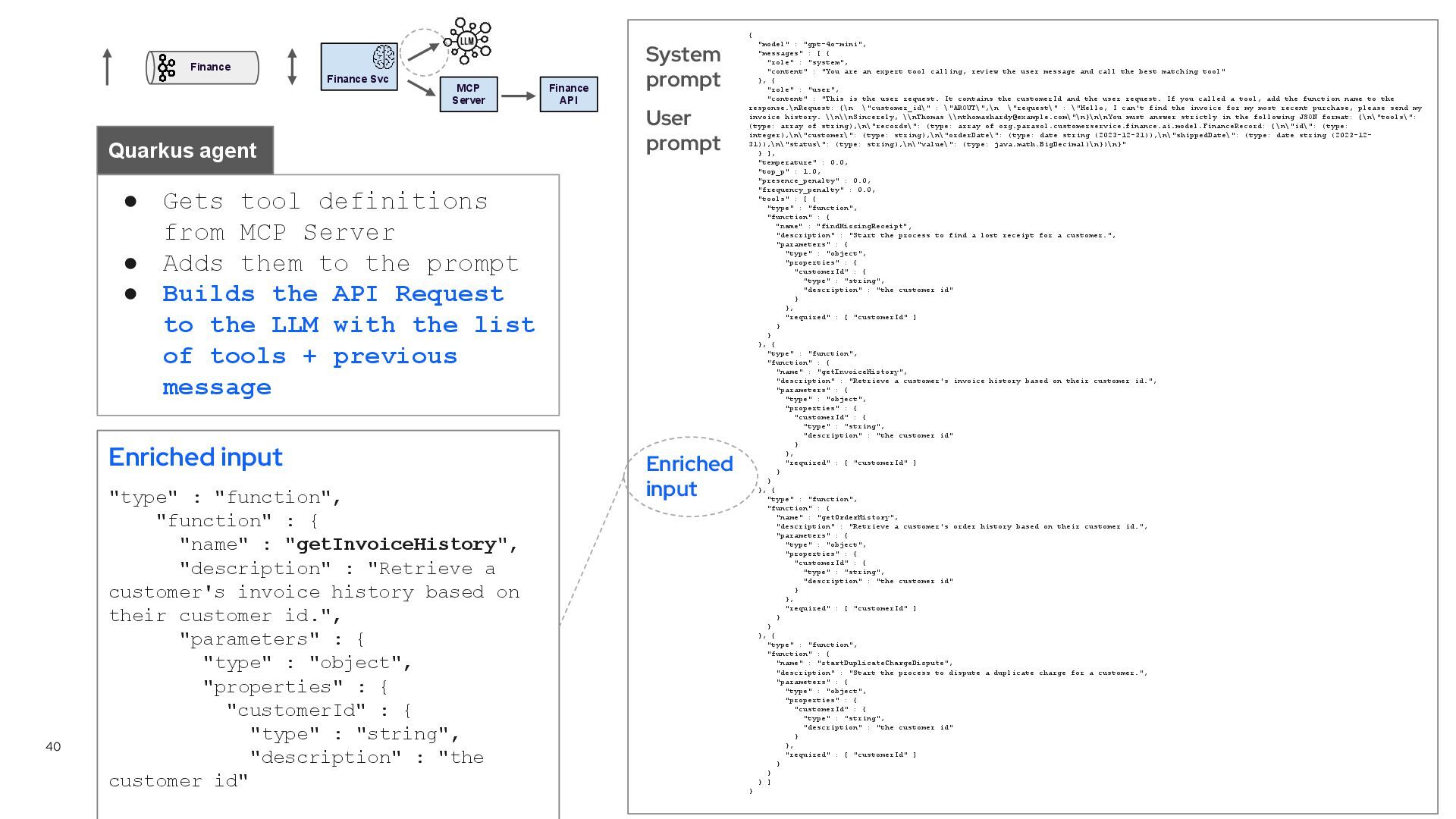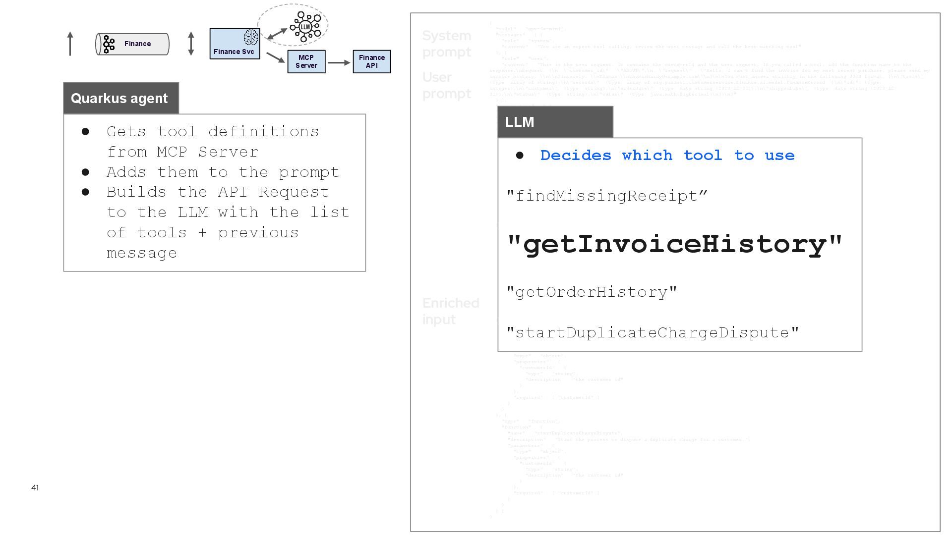 tool definitions from MCP Server • Adds them to the prompt • Builds the API Request to the LLM with the list of tools + previous message Quarkus agent { "model" : "gpt-4o-mini", "messages" : [ { "role" : "system", "content" : "You are an expert tool calling, review the user message and call the best matching tool" }, { "role" : "user", "content" : "This is the user request. It contains the customerId and the user request. If you called a tool, add the function name to the response.\nRequest: {\n \"customer_id\" : \"AROUT\",\n \"request\" : \"Hello, I can't find the invoice for my most recent purchase, please send my invoice history. \\n\\nSincerely, \\nThomas \\