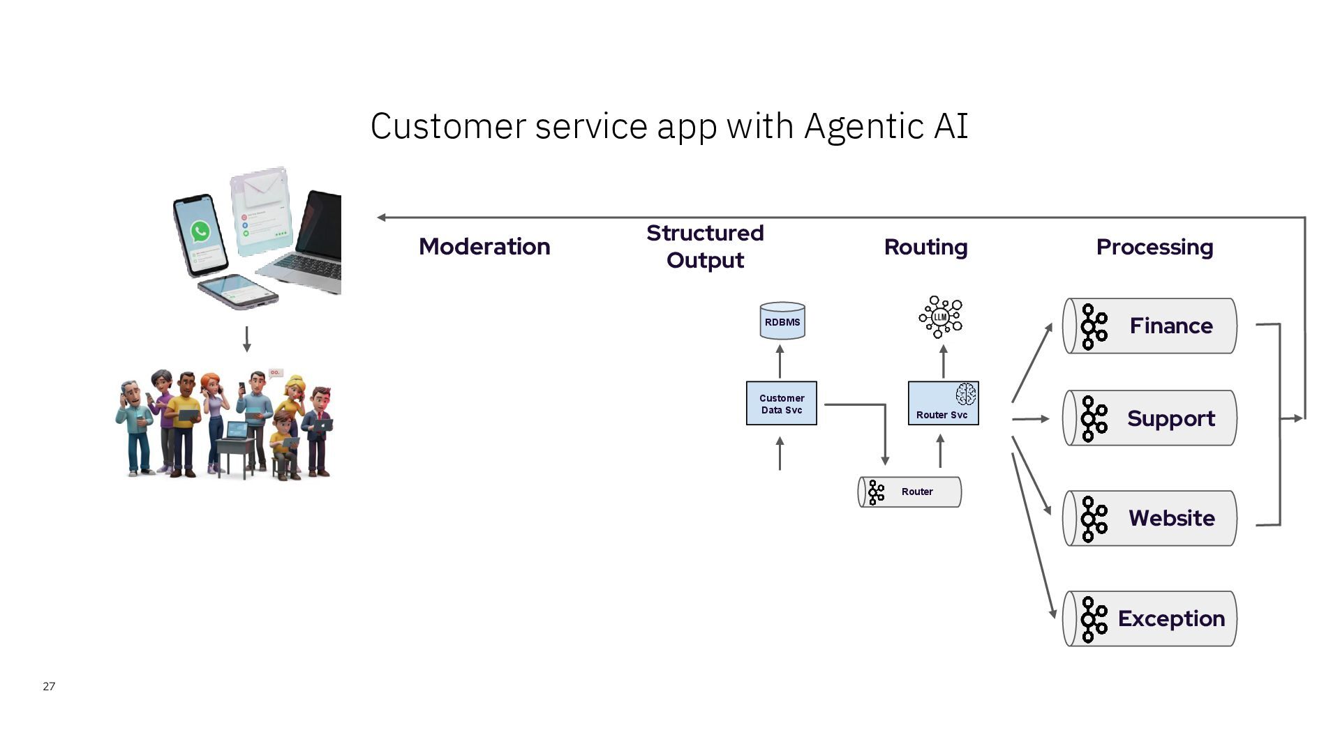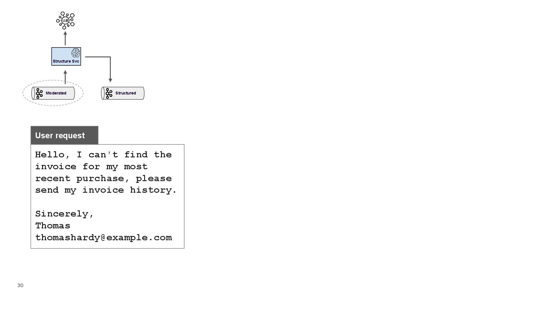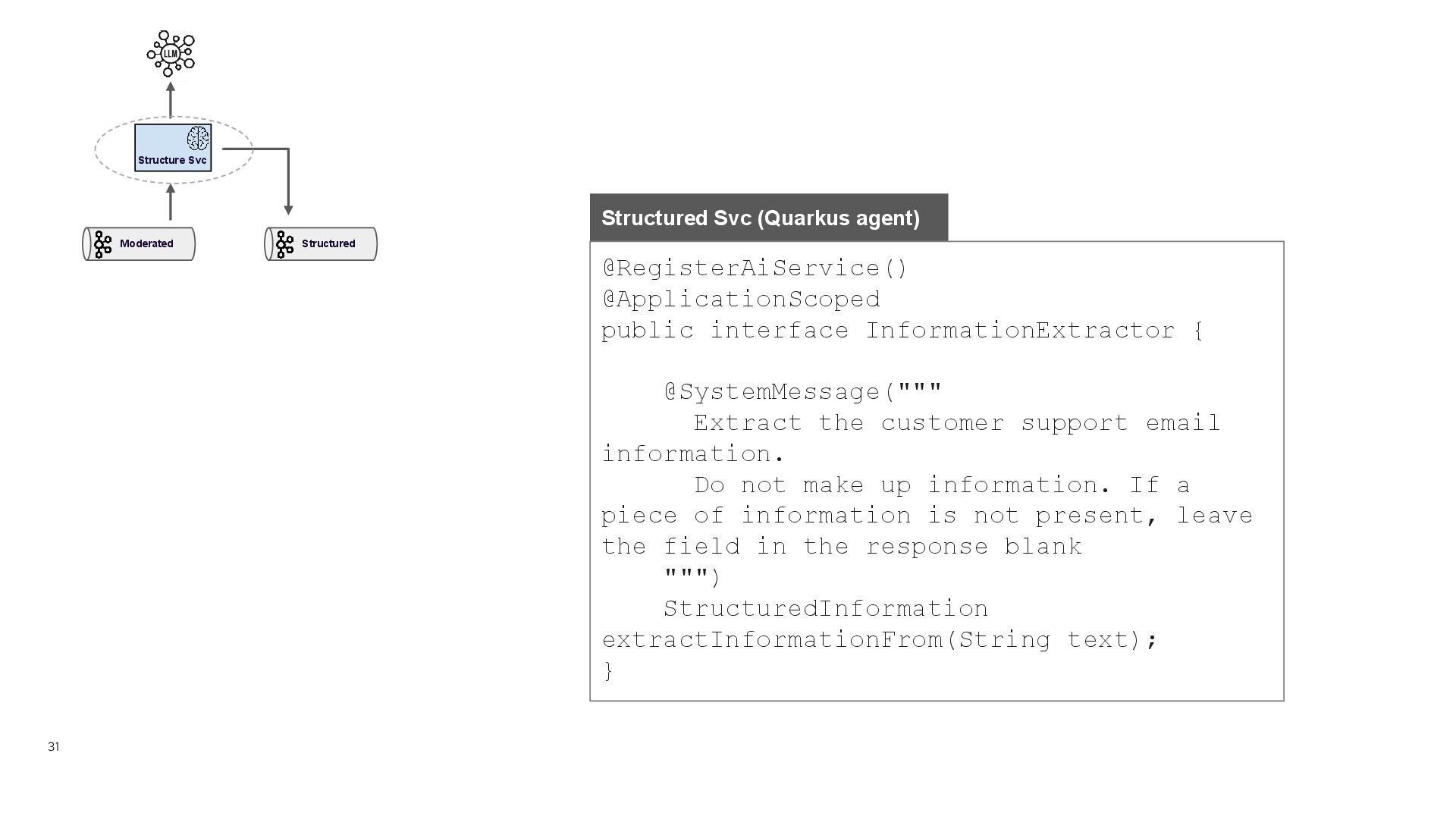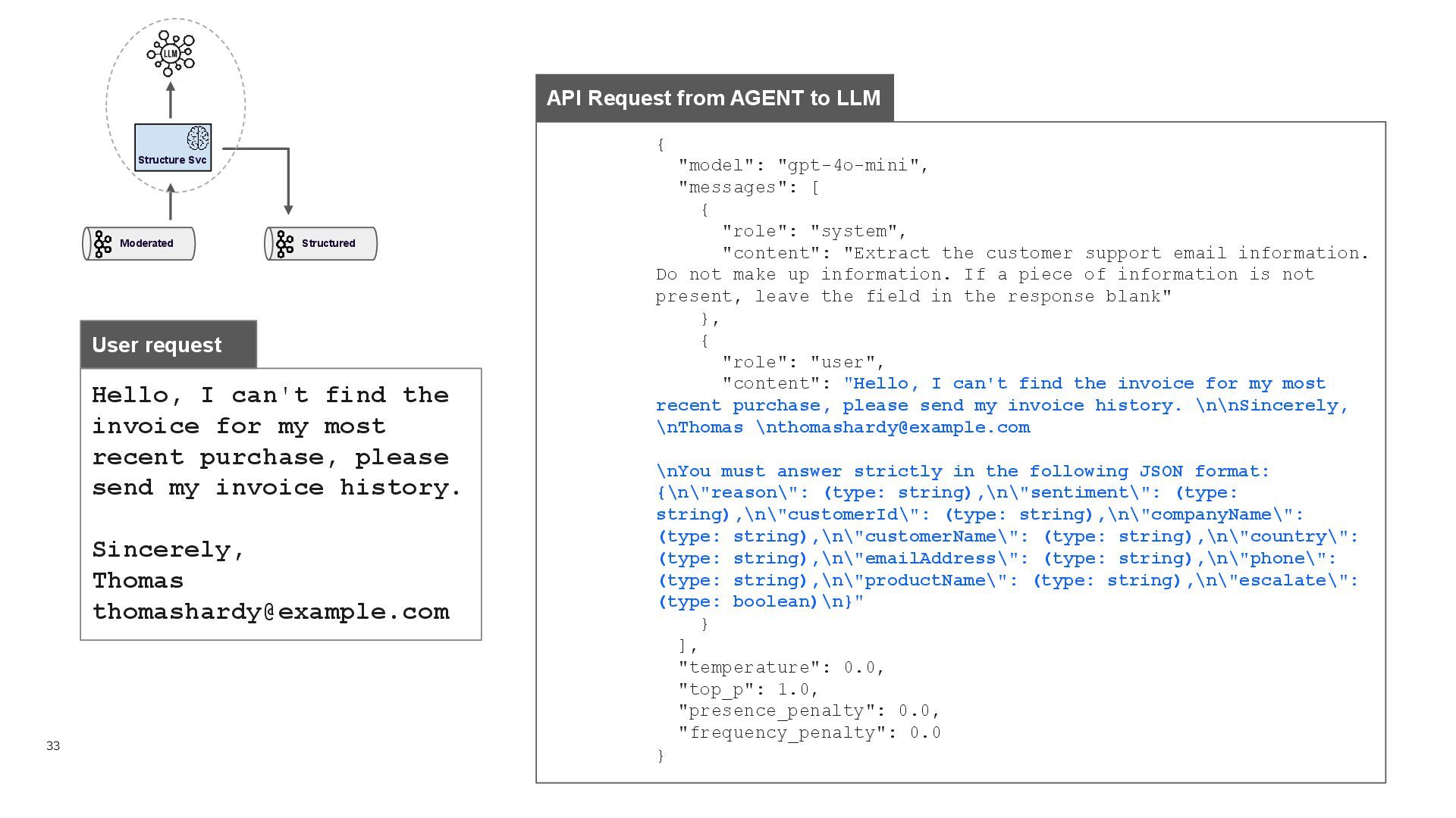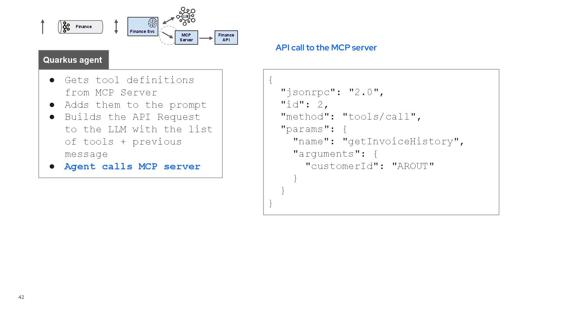 tool definitions from MCP Server • Adds them to the prompt • Builds the API Request to the LLM with the list of tools + previous message Quarkus agent { "model" : "gpt-4o-mini", "messages" : [ { "role" : "system", "content" : "You are an expert tool calling, review the user message and call the best matching tool" }, { "role" : "user", "content" : "This is the user request. It contains the customerId and the user request. If you called a tool, add the function name to the response.\nRequest: {\n \"customer_id\" : \"AROUT\",\n \"request\" : \"Hello, I can't find the invoice for my most recent purchase, please send my invoice history. \\n\\nSincerely, \\nThomas \\