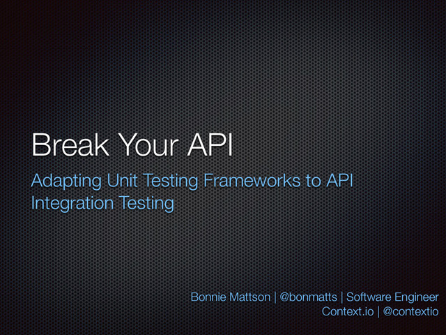 API before your customers do. • There is no “right” way to test your API. Programatic integration test suites using unit testing frameworks is one approach. • Use whatever framework you want to. • We use a combination of tools to test and monitor context.io, including Runscope