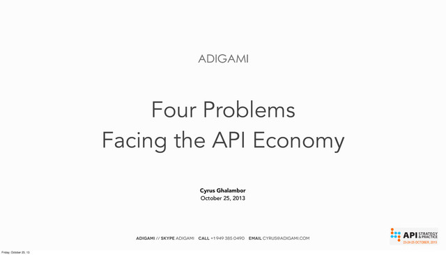 [email protected] + Four Problems facing the API economy 1. Too Many API’s • 10,000+ API’s • Doubling every 6 months! 2. API’s change! • Your code breaks • Danger of “Upgrade storms” Friday, October 25, 13