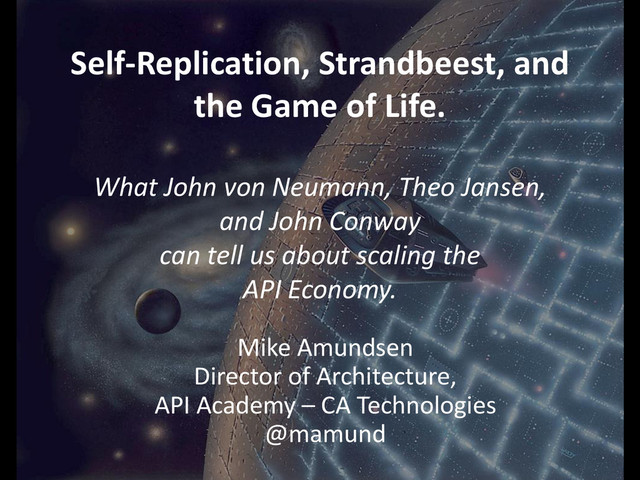 Neumann, Theo Jansen, and John Conway can tell us about scaling the API Economy. http://g.mamund.com/apistrat2014-talk Mike Amundsen Director of Architecture, API Academy – CA Technologies @mamund