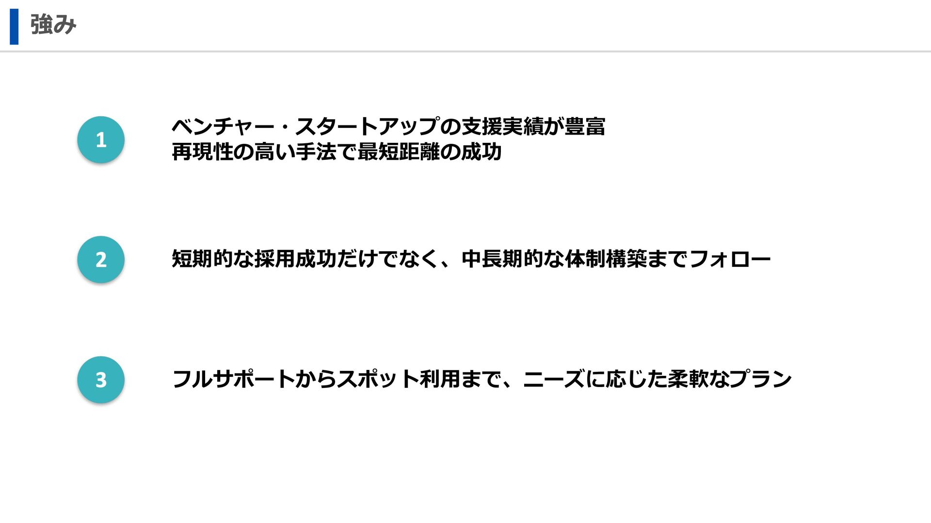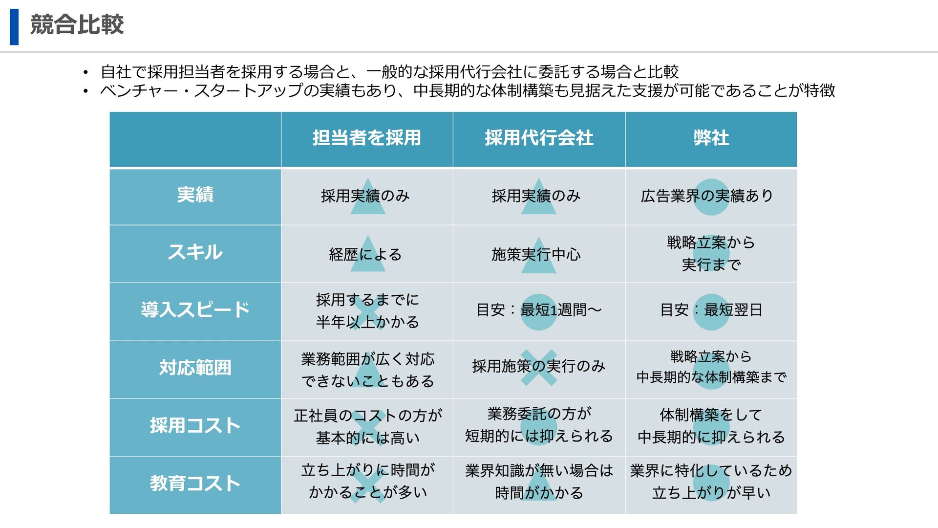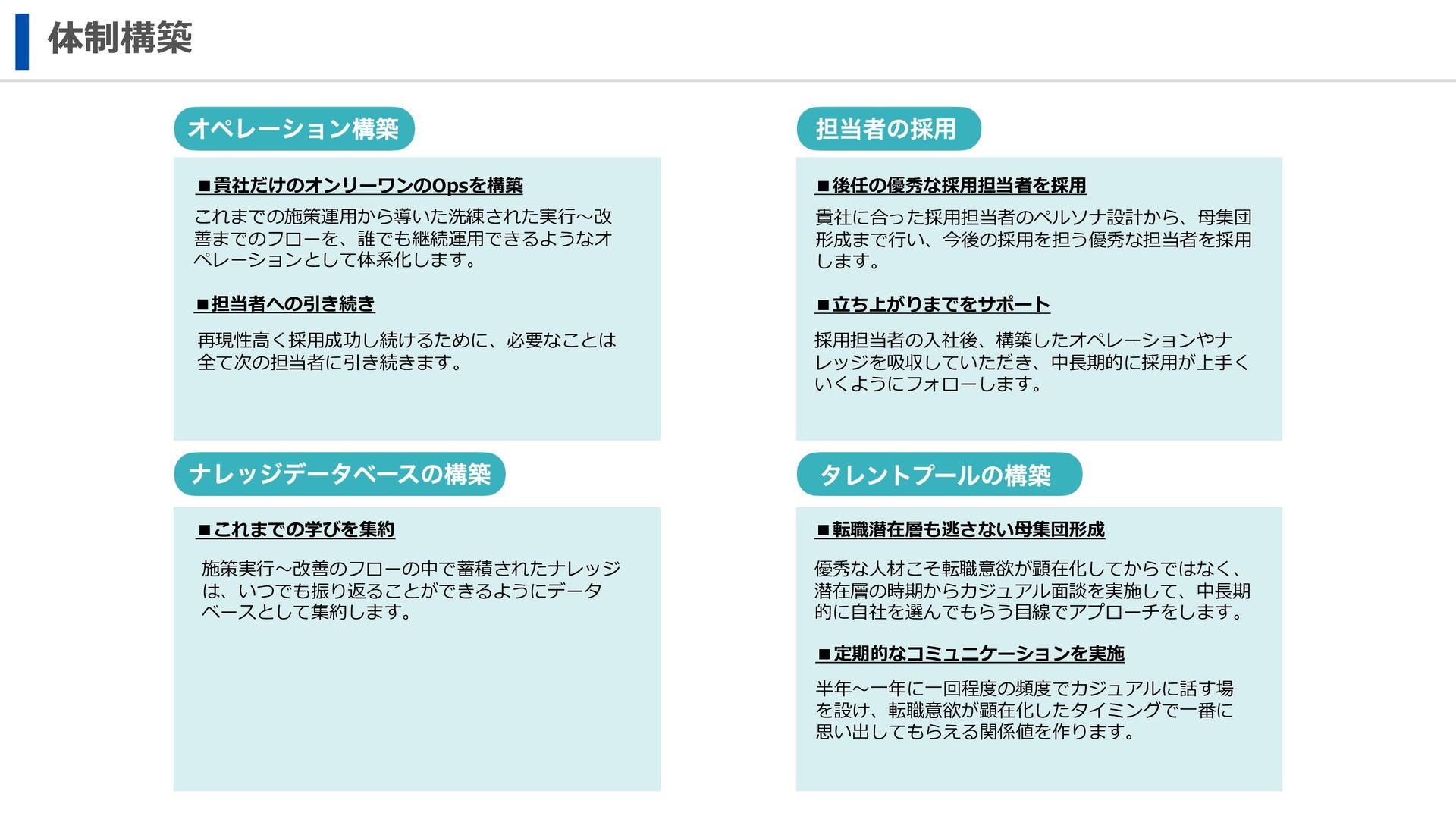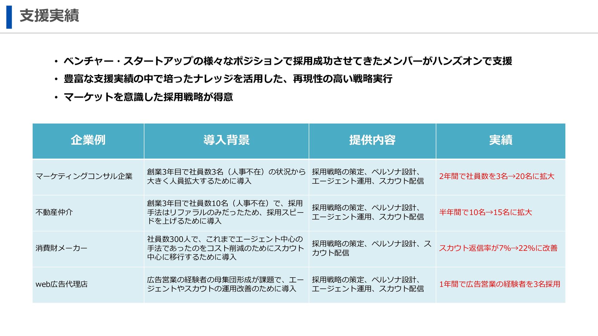 実績 マーケティングコンサル企業 創業3年⽬で社員数3名(⼈事不在)の状況から ⼤きく⼈員拡⼤するために導⼊ 採⽤戦略の策定、ペルソナ設計、 エージェント運⽤、スカウト配信 2年間で社員数を3名→20名に拡⼤ 不動産仲介 創業3年⽬で社員数10名(⼈事不在)で、採⽤ ⼿法はリファラルのみだったため、採⽤スピー ドを上げるために導⼊ 採⽤戦略の策定、ペルソナ設計、 エージェント運⽤、スカウト配信 半年間で10名→15名に拡⼤ 消費財メーカー 社員数300⼈で、これまでエージェント中⼼の ⼿法であったのをコスト削減のためにスカウト 中⼼に移⾏するために導⼊ 採⽤戦略の策定、ペルソナ設計、ス カウト配信 スカウト返信率が7%→22%に改善 web広告代理店 広告営業の経験者の⺟集団形成が課題で、エー ジェントやスカウトの運⽤改善のために導⼊ 採⽤戦略の策定、ペルソナ設計、 エージェント運⽤、スカウト配信 1年間で広告営業の経験者を3名採⽤
