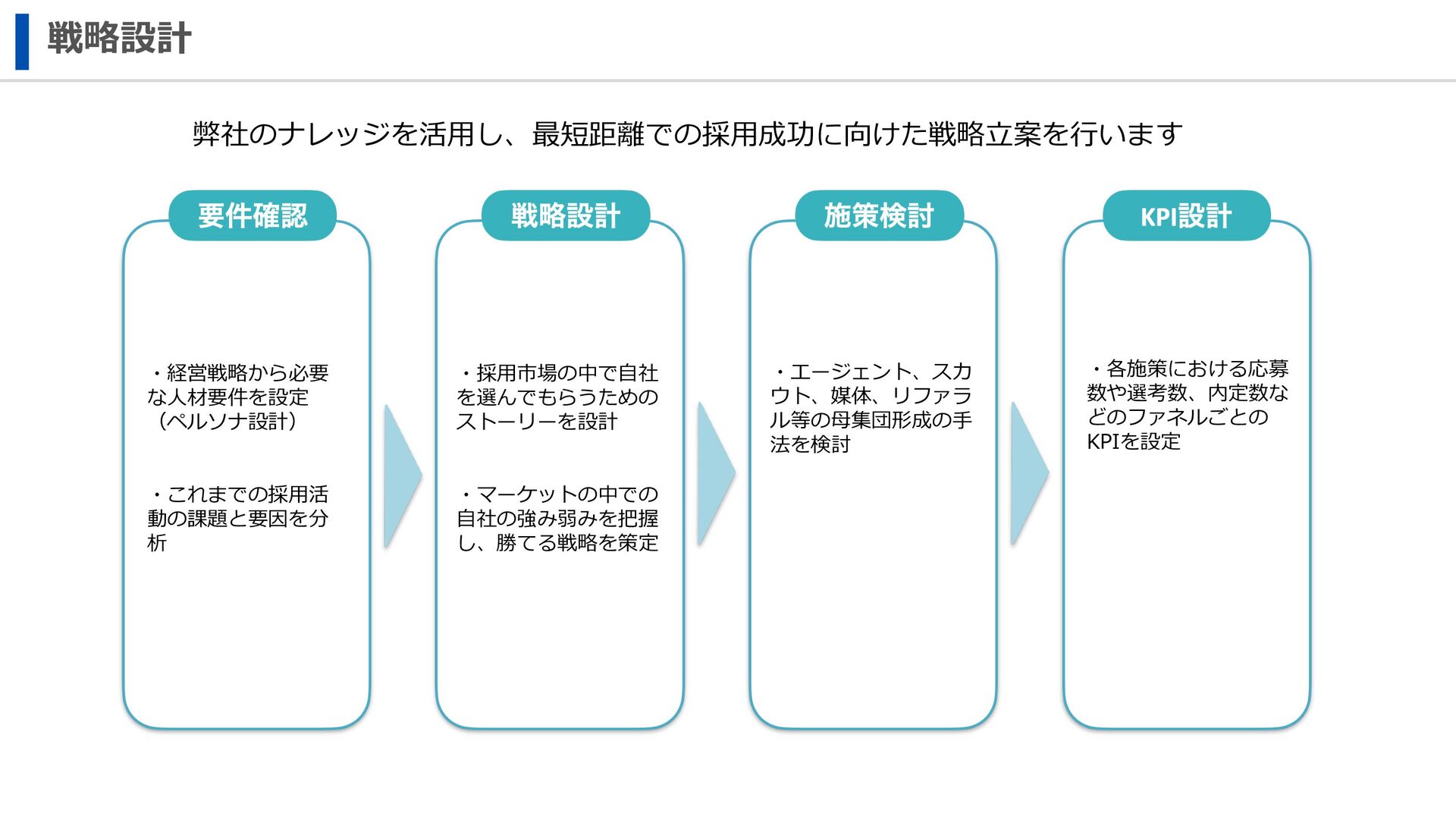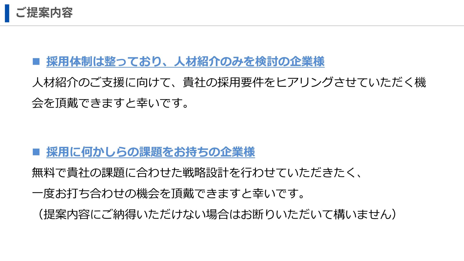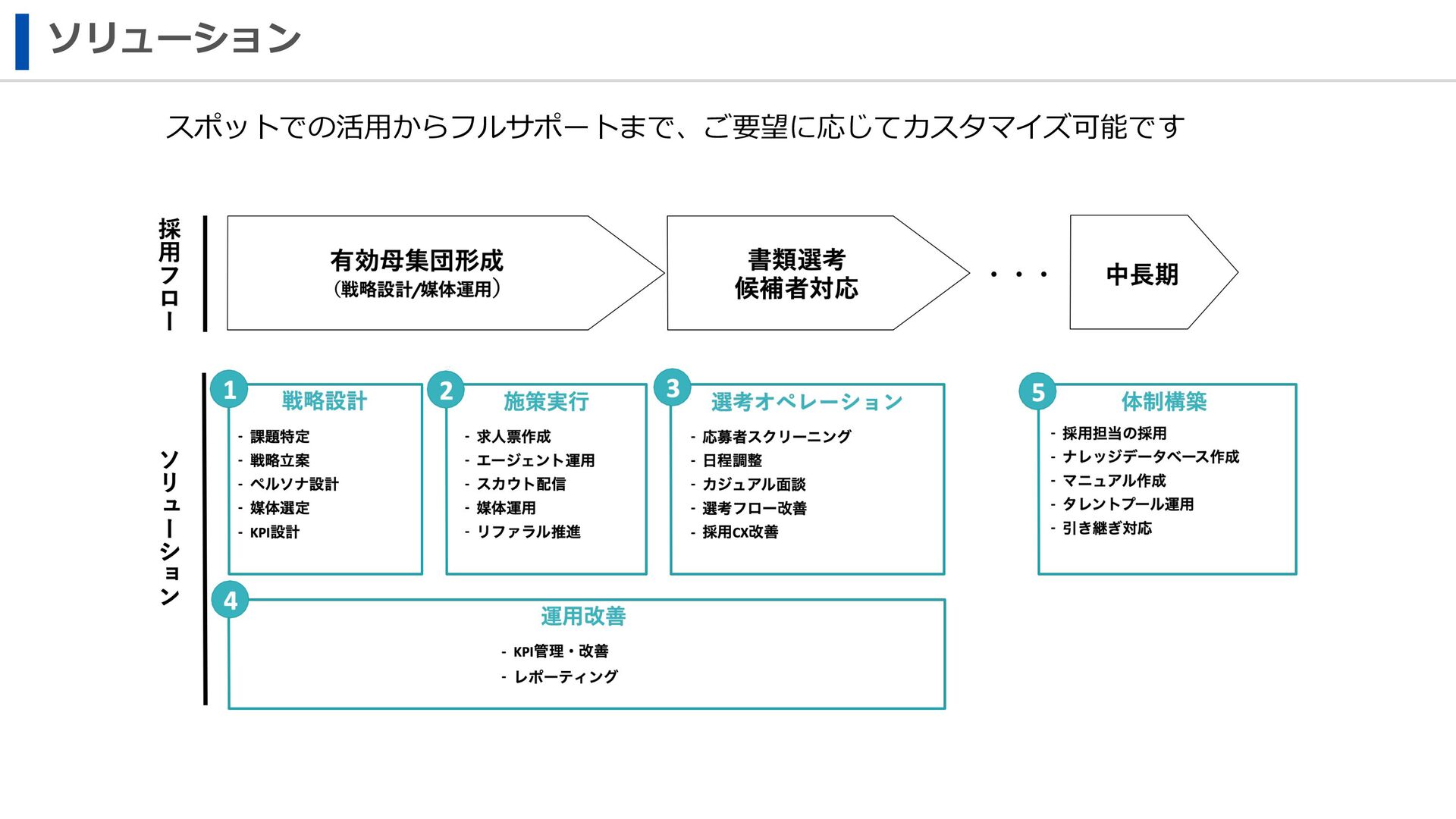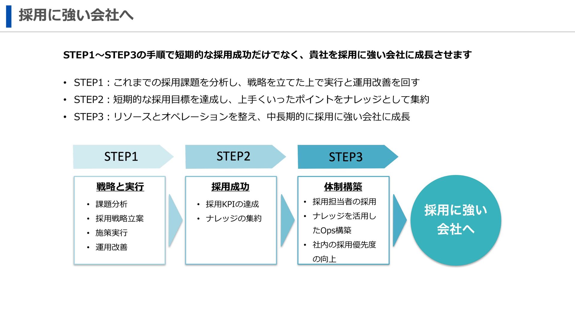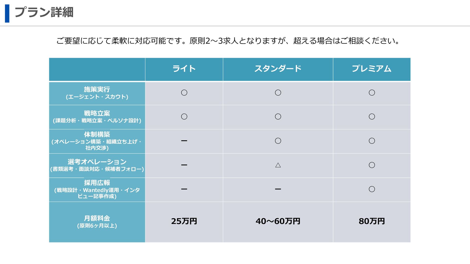 実績 マーケティングコンサル企業 創業3年⽬で社員数3名(⼈事不在)の状況から ⼤きく⼈員拡⼤するために導⼊ 採⽤戦略の策定、ペルソナ設計、 エージェント運⽤、スカウト配信 2年間で社員数を3名→20名に拡⼤ 不動産仲介 創業3年⽬で社員数10名(⼈事不在)で、採⽤ ⼿法はリファラルのみだったため、採⽤スピー ドを上げるために導⼊ 採⽤戦略の策定、ペルソナ設計、 エージェント運⽤、スカウト配信 半年間で10名→15名に拡⼤ 消費財メーカー 社員数300⼈で、これまでエージェント中⼼の ⼿法であったのをコスト削減のためにスカウト 中⼼に移⾏するために導⼊ 採⽤戦略の策定、ペルソナ設計、ス カウト配信 スカウト返信率が7%→22%に改善 web広告代理店 広告営業の経験者の⺟集団形成が課題で、エー ジェントやスカウトの運⽤改善のために導⼊ 採⽤戦略の策定、ペルソナ設計、 エージェント運⽤、スカウト配信 1年間で広告営業の経験者を3名採⽤