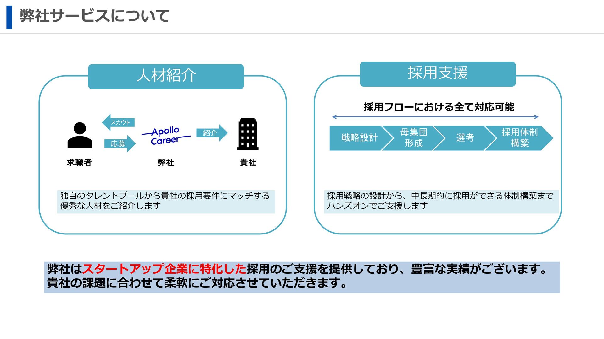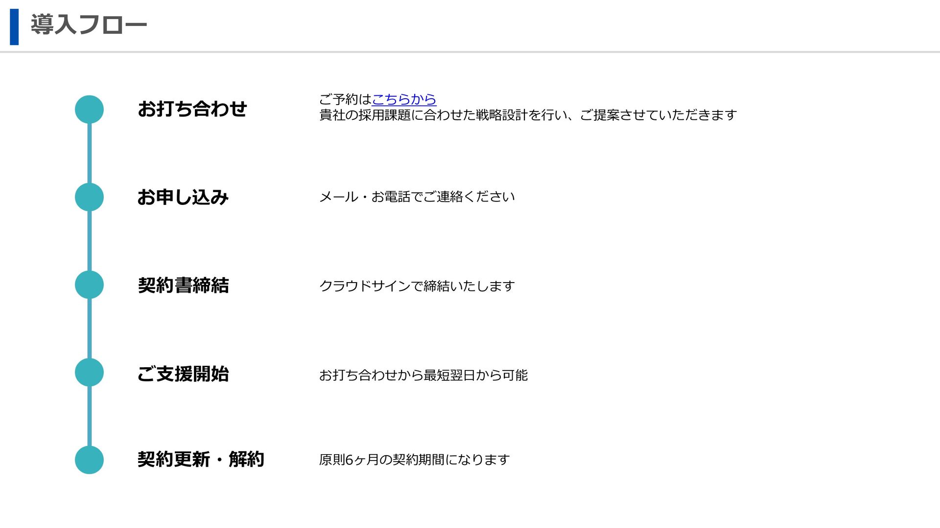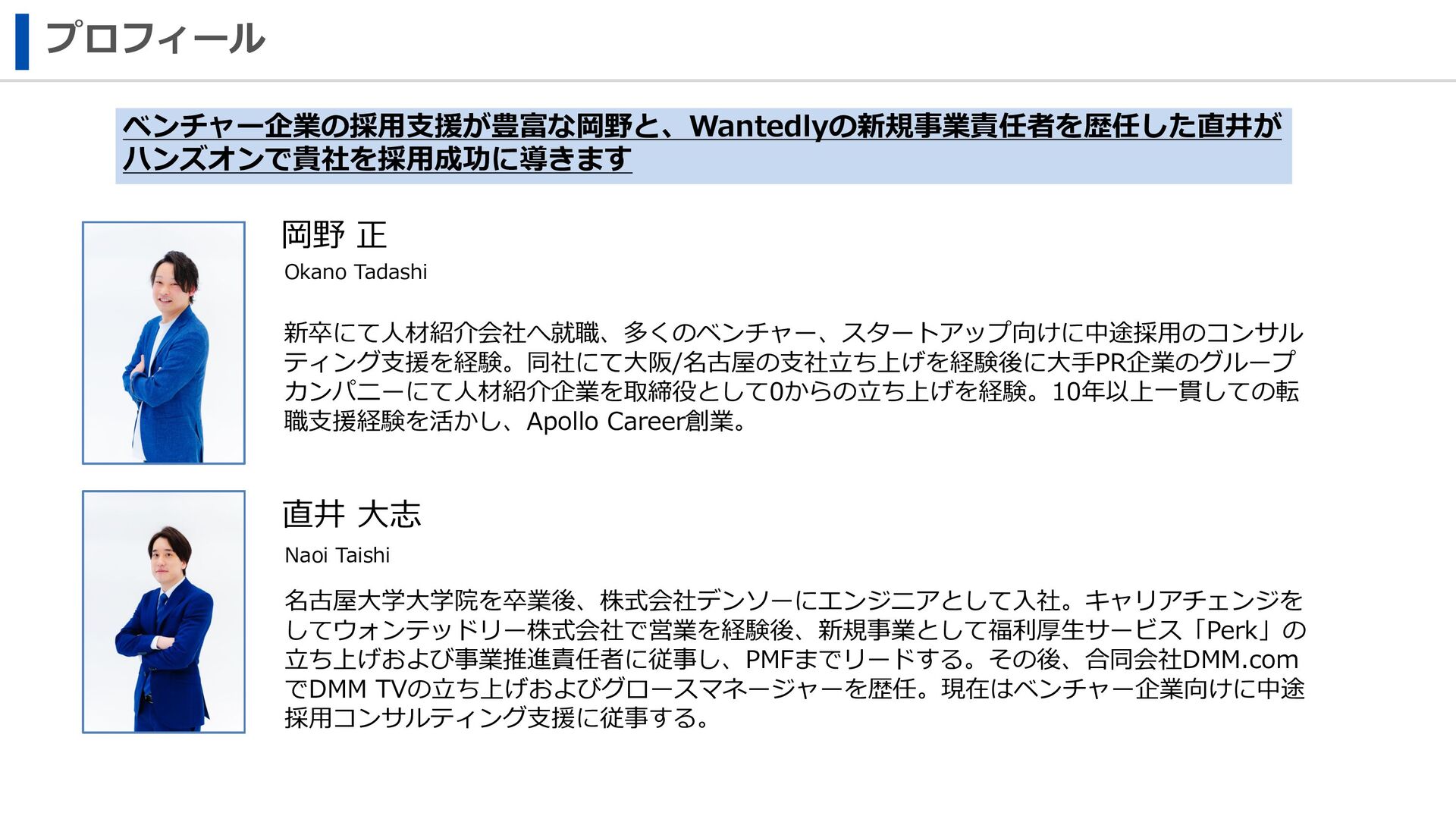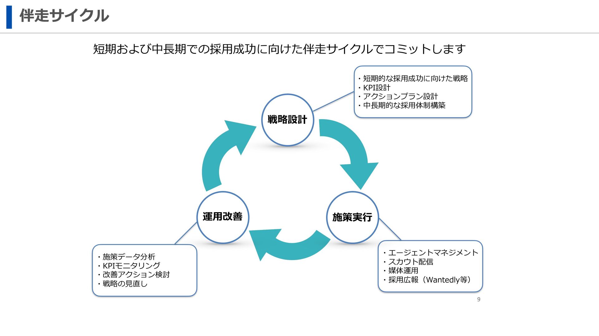 実績 マーケティングコンサル企業 創業3年⽬で社員数3名(⼈事不在)の状況から ⼤きく⼈員拡⼤するために導⼊ 採⽤戦略の策定、ペルソナ設計、 エージェント運⽤、スカウト配信 2年間で社員数を3名→20名に拡⼤ 不動産仲介 創業3年⽬で社員数10名(⼈事不在)で、採⽤ ⼿法はリファラルのみだったため、採⽤スピー ドを上げるために導⼊ 採⽤戦略の策定、ペルソナ設計、 エージェント運⽤、スカウト配信 半年間で10名→15名に拡⼤ 消費財メーカー 社員数300⼈で、これまでエージェント中⼼の ⼿法であったのをコスト削減のためにスカウト 中⼼に移⾏するために導⼊ 採⽤戦略の策定、ペルソナ設計、ス カウト配信 スカウト返信率が7%→22%に改善 web広告代理店 広告営業の経験者の⺟集団形成が課題で、エー ジェントやスカウトの運⽤改善のために導⼊ 採⽤戦略の策定、ペルソナ設計、 エージェント運⽤、スカウト配信 1年間で広告営業の経験者を3名採⽤