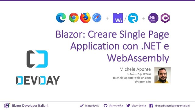 Blazor WASM vs Blazor Server Blazor WebAssembly Blazor Server Pro: - Dimensione download, load time rapido - Può utilizzare tutto il runtime .NET - Il codice è tutto sul server - Semplifica l’architettura Contro: - Latenza - Nessun supporto offline - Consuma più risorse server - Scalabilità SignalR (risolvibile) Pro: - Vera SPA, interattività completa - Utilizza le risorse del client - Supporto offline, siti statici, scenari PWA Contro: - Dimensione del download - Richiede WebAssembly - Ancora in preview