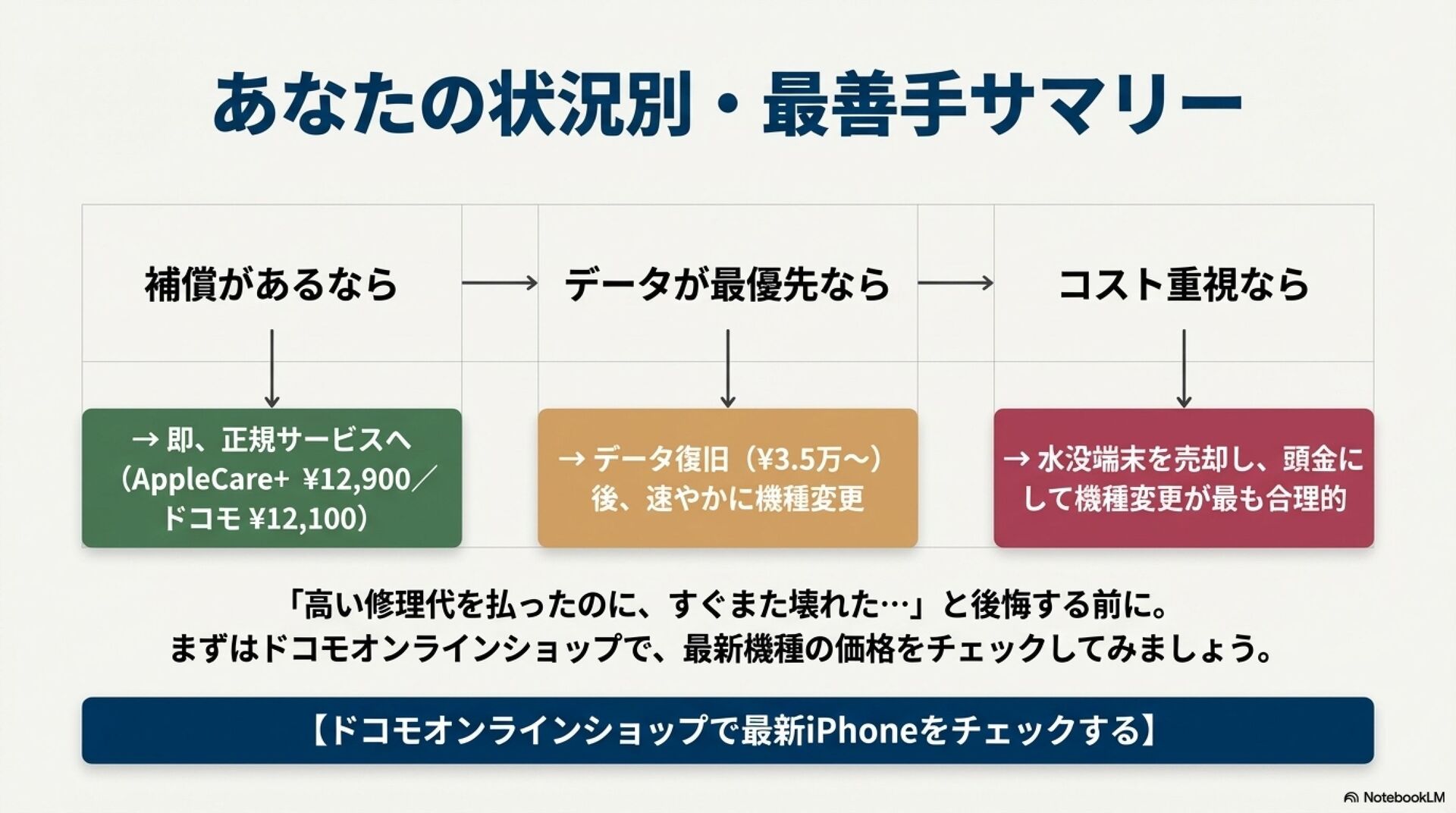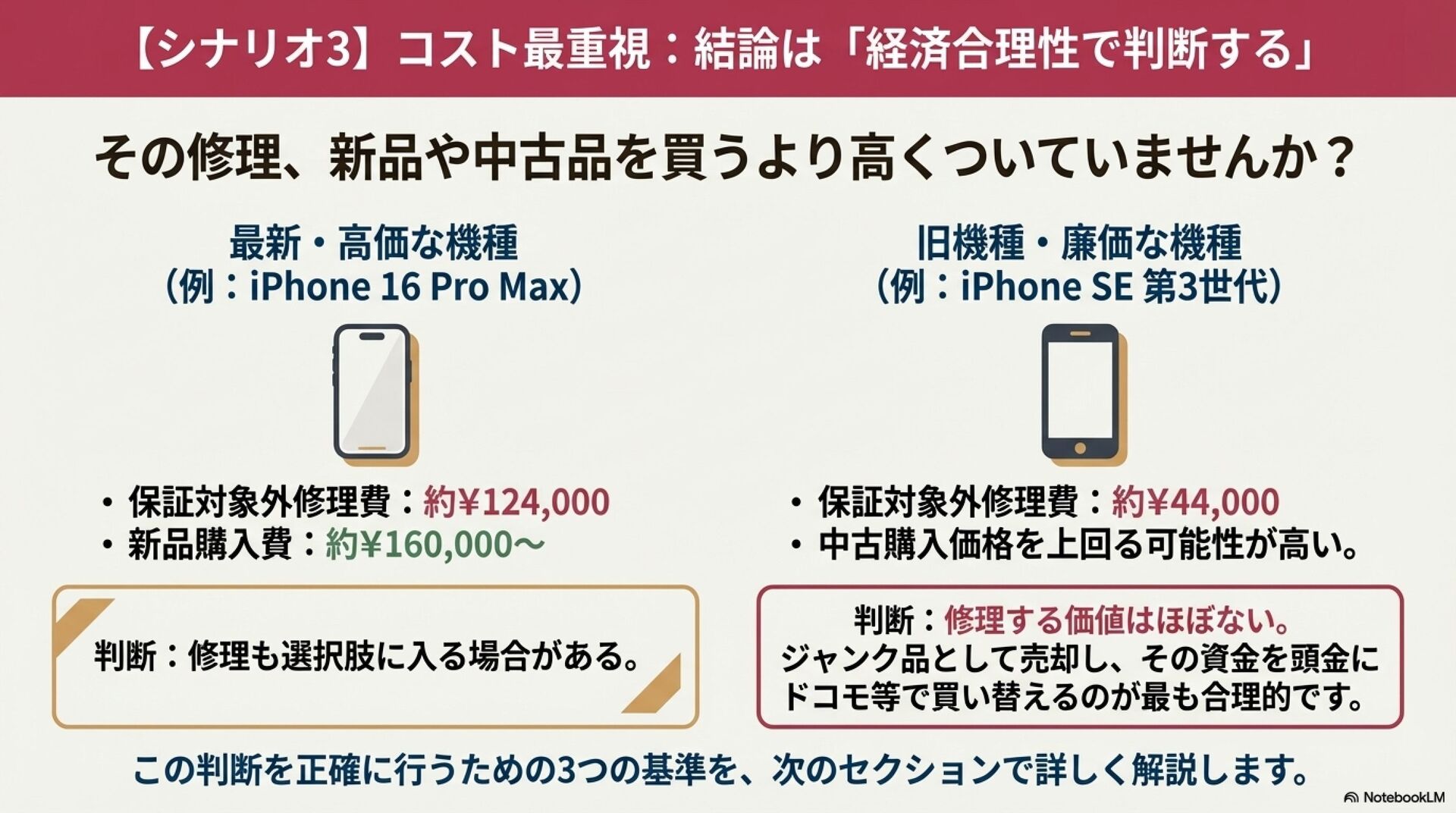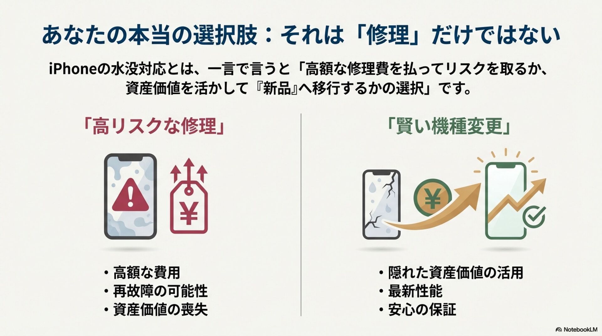 このガイドの目的は、単なる応急処置の方法を解説することではありません。あなたの本当の選択肢を再定義することです。これは「高リスクな修理」に望みを託すか、それとも端末に残された「資産価値を活かした賢い機種変更」という新たな始まりを選ぶか、という戦略的な判断なのです。私たちのゴールは、あなたがこの困難な状況で感情に流されることなく、後悔のない最善の決断を下せるよう、明確な道筋を示すことです。