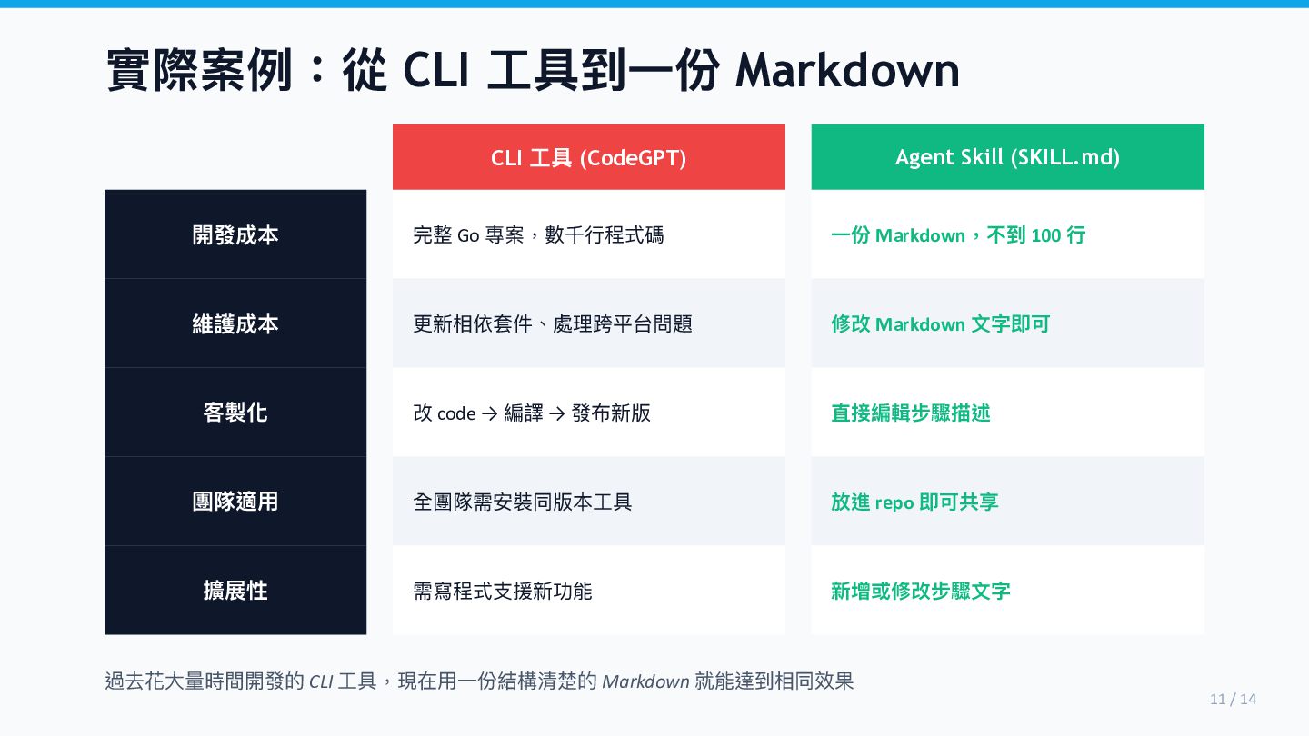 (CodeGPT) Agent Skill (SKILL.md) 開發成本 完整 Go 專案,數千 行 程式碼 一 份 Markdown,不到 100 行 維護成本 更新相依套件、處理跨平台問題 修改 Markdown 文 字即可 客製化 改 code → 編譯 → 發布新版 直接編輯步驟描述 團隊適 用 全團隊需安裝同版本 工 具 放進 repo 即可共享 擴展性 需寫程式 支 援新功能 新增或修改步驟 文 字 過去花 大 量時間開發的 CLI 工 具,現在 用一 份結構清楚的 Markdown 就能達到相同效果 11 / 14