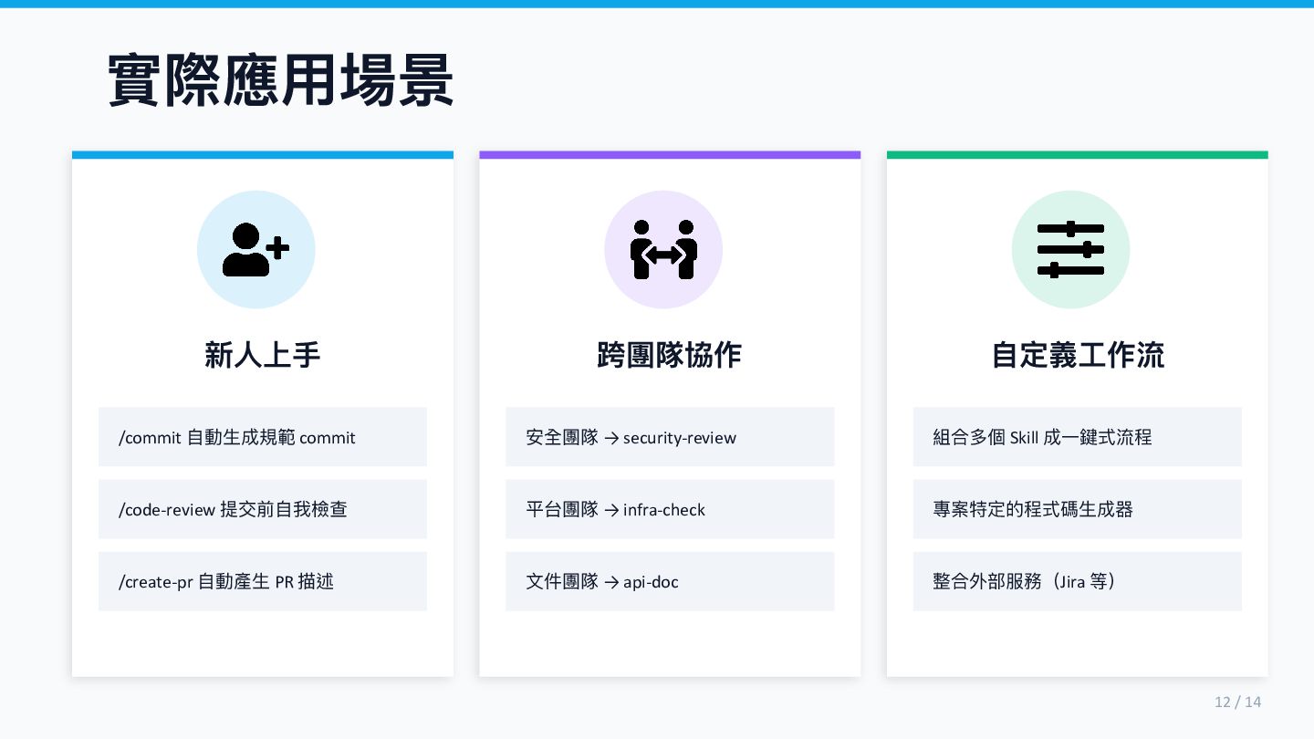 生 成規範 commit /code-review 提交前 自 我檢查 /create-pr 自 動產 生 PR 描述 跨團隊協作 安全團隊 → security-review 平台團隊 → infra-check 文 件團隊 → api-doc 自 定義 工 作流 組合多個 Skill 成 一 鍵式流程 專案特定的程式碼 生 成器 整合外部服務(Jira 等) 12 / 14