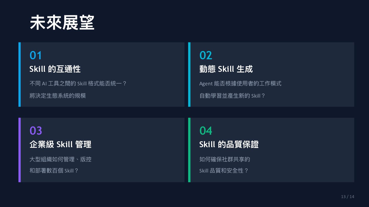 一 ? 將決定 生 態系統的規模 02 動態 Skill 生 成 Agent 能否根據使 用 者的 工 作模式 自 動學習並產 生 新的 Skill? 03 企業級 Skill 管理 大 型組織如何管理、版控 和部署數百個 Skill? 04 Skill 的品質保證 如何確保社群共享的 Skill 品質和安全性? 13 / 14