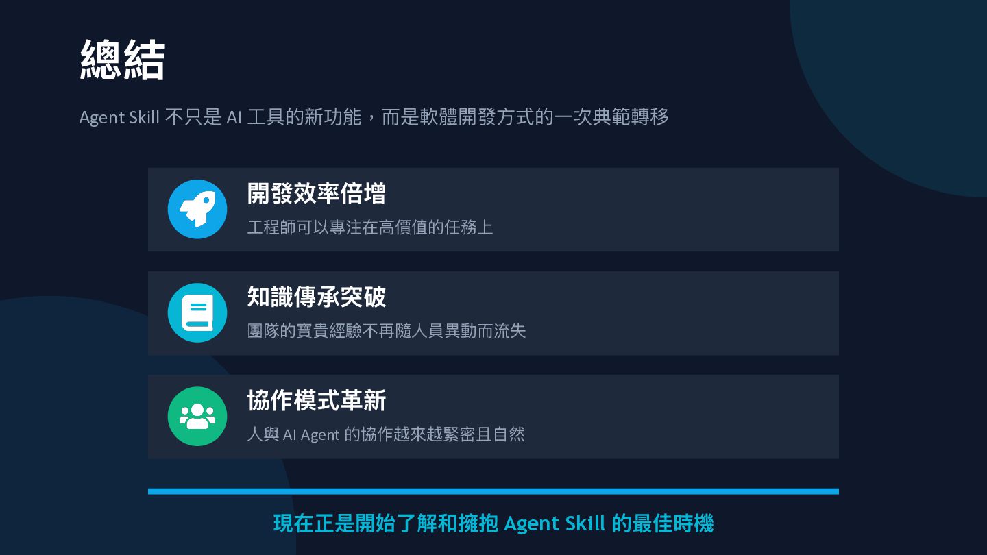 13. 總結 Agent Skill 不只是 AI 工 具的新功能, 而 是軟體開發 方