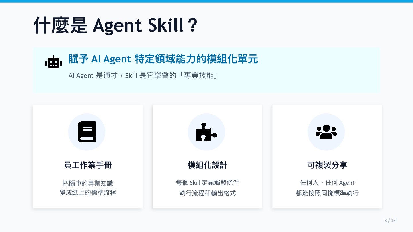 2. 什麼是 Agent Skill? 賦予 AI Agent 特定領域能 力 的模組化單元 AI