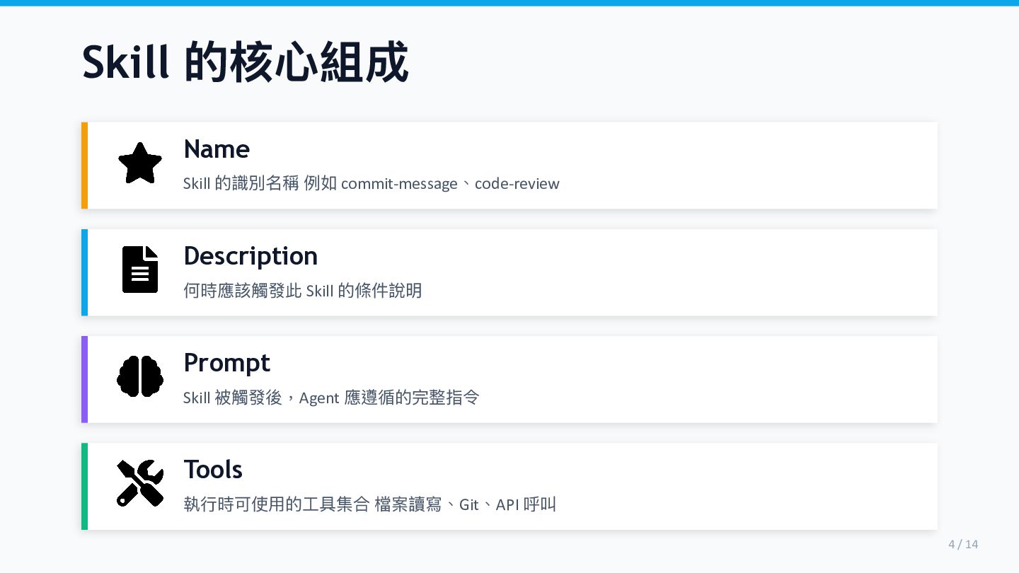 Agent 是通才,Skill 是它學會的「專業技能」 員 工 作業 手 冊 把腦中的專業知識 變成紙上的標準流程 模組化設計 每個 Skill 定義觸發條件 執 行 流程和輸出格式 可複製分享 任何 人 、任何 Agent 都能按照同樣標準執 行 3 / 14