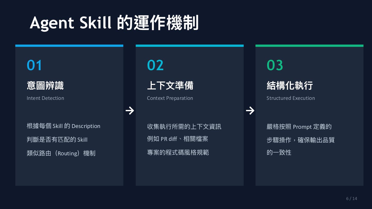 Description 判斷是否有匹配的 Skill 類似路由(Routing)機制 02 上下 文 準備 Context Preparation 收集執 行 所需的上下 文 資訊 例如 PR diff、相關檔案 專案的程式碼風格規範 03 結構化執 行 Structured Execution 嚴格按照 Prompt 定義的 步驟操作,確保輸出品質 的 一 致性 6 / 14