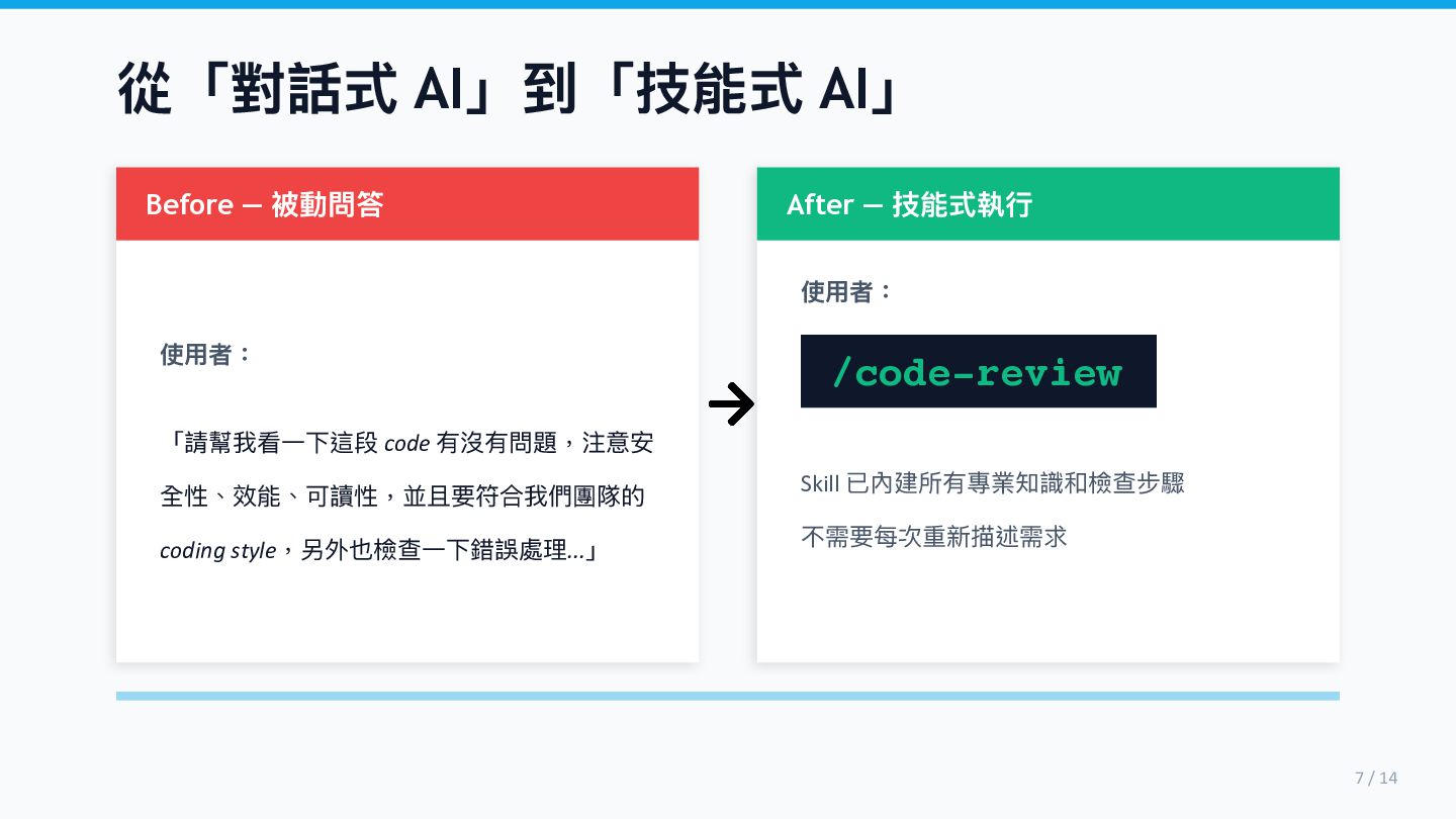 6. 從「對話式 AI」到「技能式 AI」 Before — 被動問答 使 用 者: 「請幫我看