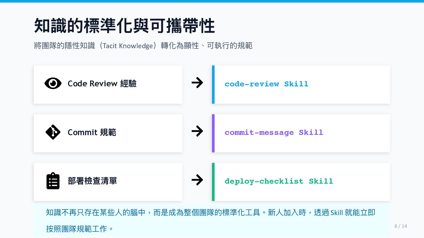 7. 知識的標準化與可攜帶性 將團隊的隱性知識(Tacit Knowledge)轉化為顯性、可執 行 的規範 Code Review 經驗 code-review Skill