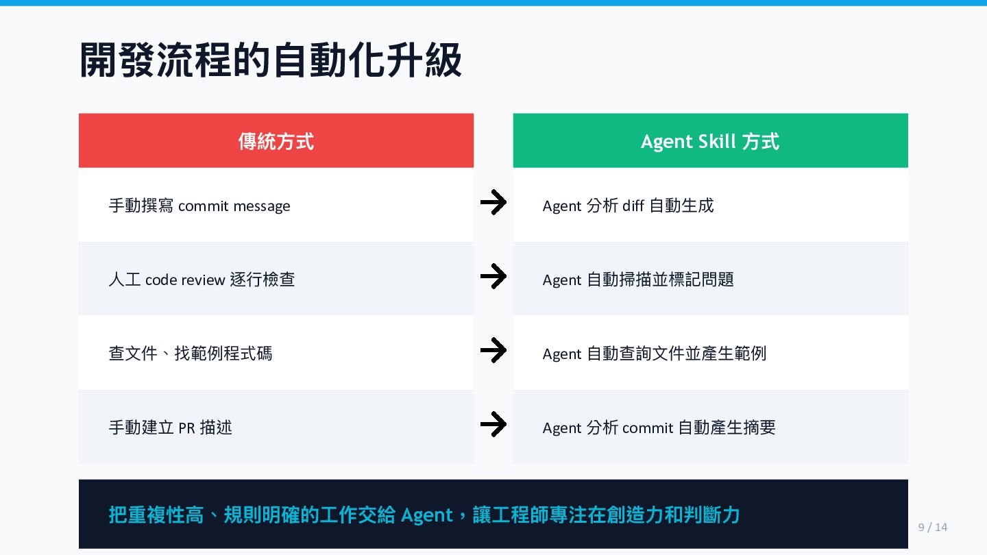 8. 開發流程的 自 動化升級 傳統 方 式 Agent Skill 方 式
