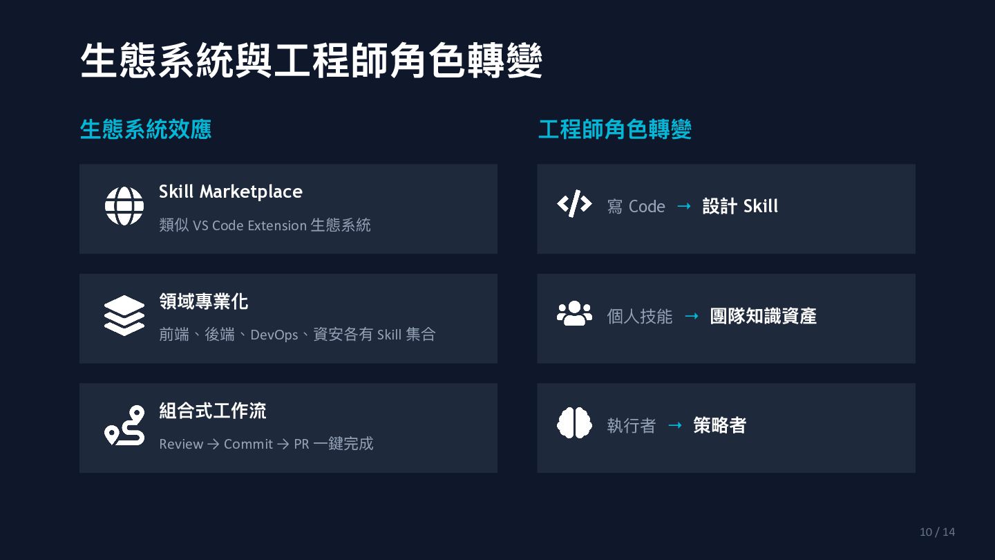 9. 生 態系統與 工 程師 角色 轉變 生 態系統效應 Skill Marketplace