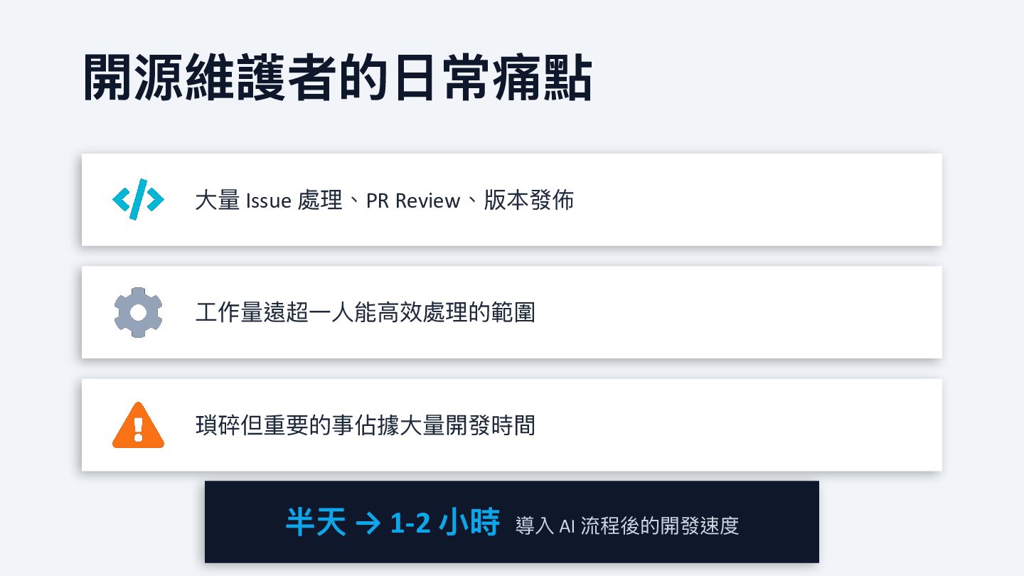 2. 開源維護者的 日 常痛點 大 量 Issue 處理、PR Review、版本發佈 工 作量遠超