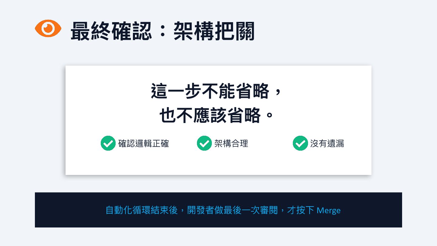 品質更好 AI 過濾基本問題, 人 工 專注架構和業務邏輯 開發者也能有 Review 機制 Copilot 當第 一 道防線,程式碼品質有基本保障 降低上下 文 切換成本 AI 處理瑣碎實作,腦 力 留給需要思考的決策