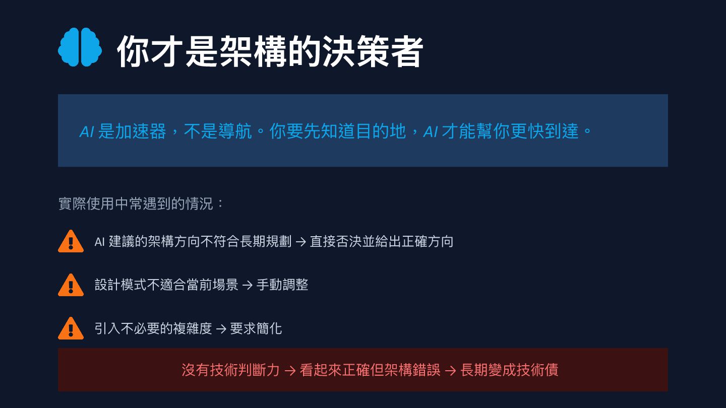 建議的架構 方 向不符合長期規劃 → 直接否決並給出正確 方 向 設計模式不適合當前場景 → 手 動調整 引入不必要的複雜度 → 要求簡化 沒有技術判斷 力 → 看起來正確但架構錯誤 → 長期變成技術債