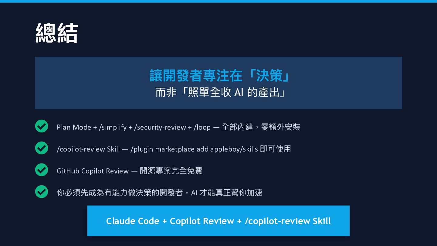 + /security-review + /loop — 全部內建,零額外安裝 /copilot-review Skill — /plugin marketplace add appleboy/skills 即可使 用 GitHub Copilot Review — 開源專案完全免費 你必須先成為有能 力 做決策的開發者,AI 才能真正幫你加速 Claude Code + Copilot Review + /copilot-review Skill