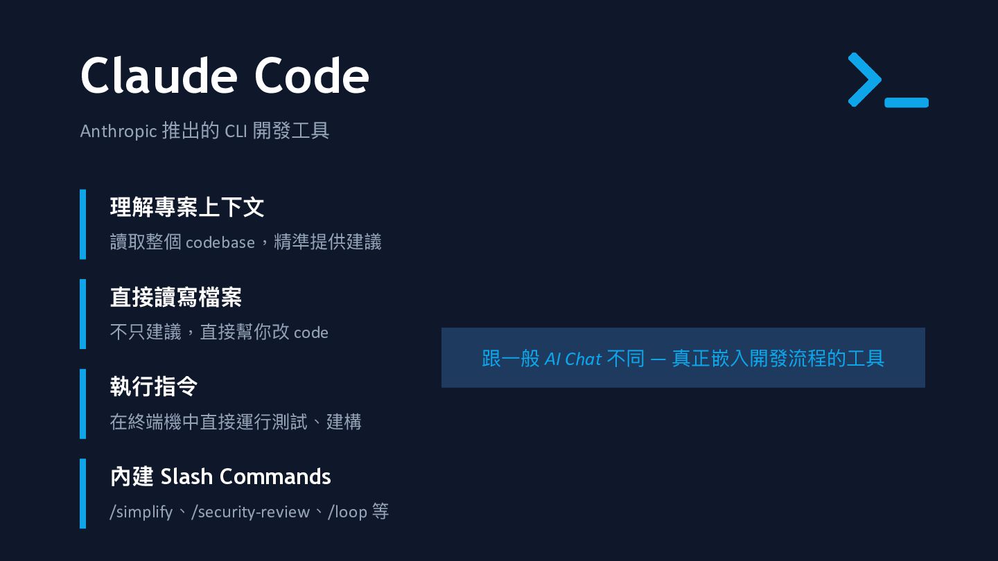 讀取整個 codebase,精準提供建議 直接讀寫檔案 不只建議,直接幫你改 code 執 行 指令 在終端機中直接運 行 測試、建構 內建 Slash Commands /simplify、/security-review、/loop 等 跟 一 般 AI Chat 不同 — 真正嵌入開發流程的 工 具