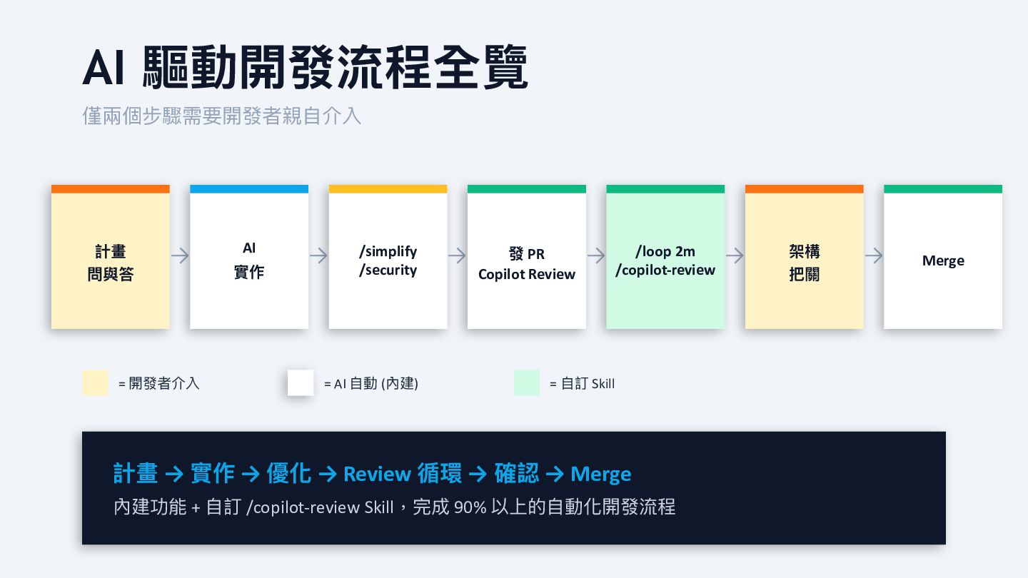 → /simplify /security → 發 PR Copilot Review → /loop 2m /copilot-review → 架構 把關 → Merge = 開發者介入 = AI 自 動 (內建) = 自 訂 Skill 計畫 → 實作 → 優化 → Review 循環 → 確認 → Merge 內建功能 + 自 訂 /copilot-review Skill,完成 90% 以上的 自 動化開發流程