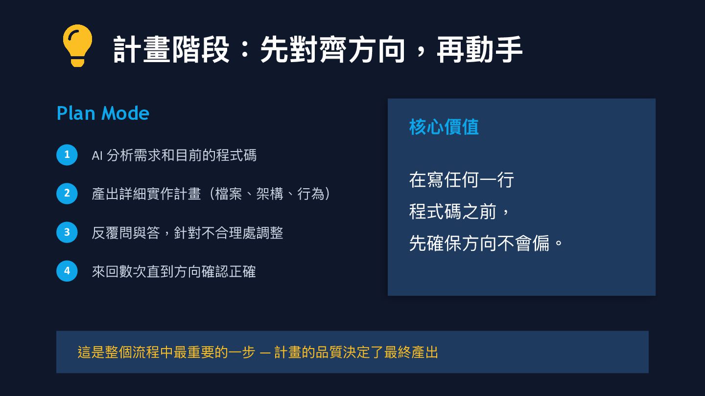前的程式碼 2 產出詳細實作計畫(檔案、架構、 行 為) 3 反覆問與答,針對不合理處調整 4 來回數次直到 方 向確認正確 核 心 價值 在寫任何 一行 程式碼之前, 先確保 方 向不會偏。 這是整個流程中最重要的 一 步 — 計畫的品質決定了最終產出