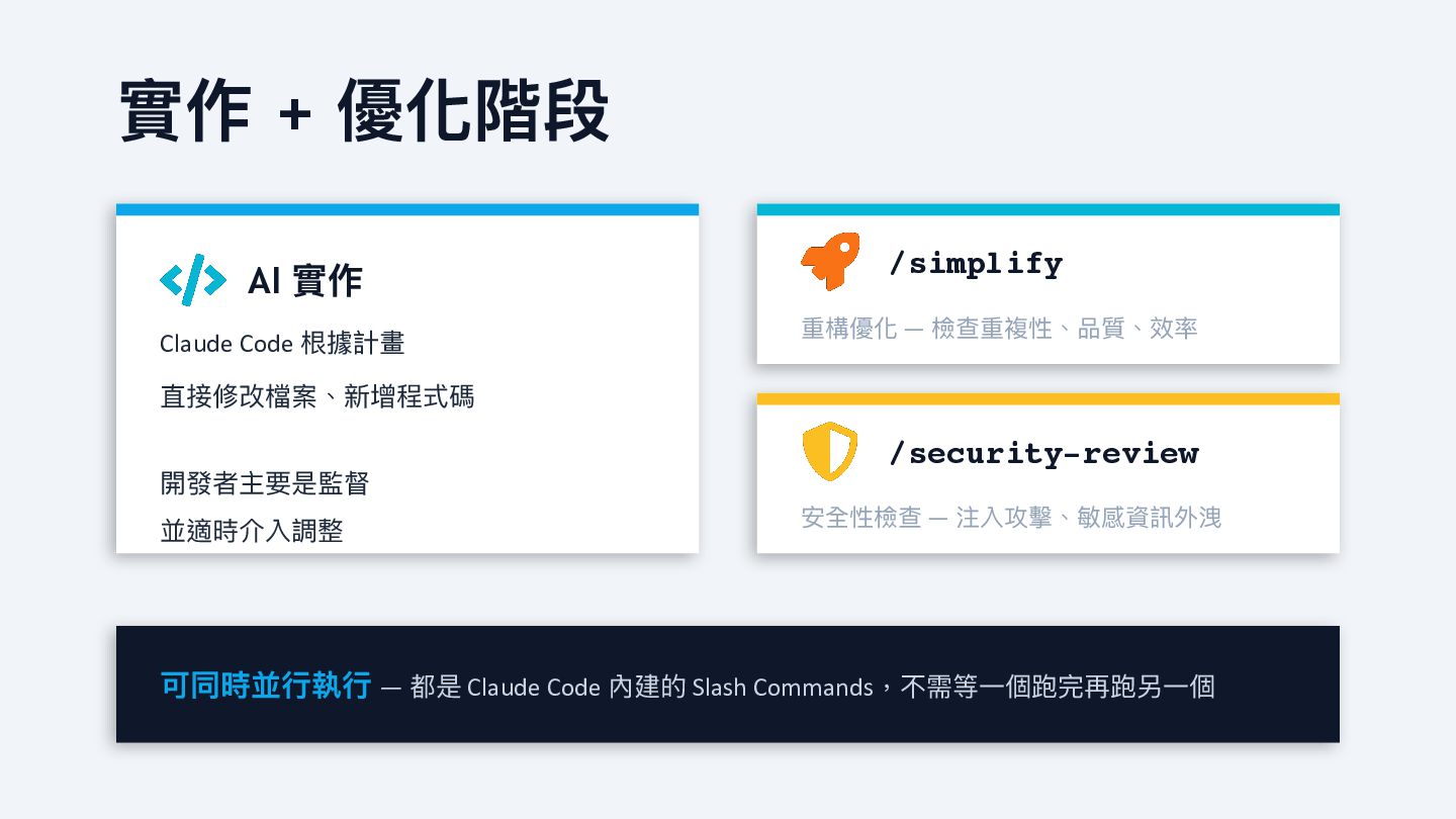 並適時介入調整 /simplify 重構優化 — 檢查重複性、品質、效率 /security-review 安全性檢查 — 注入攻擊、敏感資訊外洩 可同時並 行 執 行 — 都是 Claude Code 內建的 Slash Commands,不需等 一 個跑完再跑另 一 個