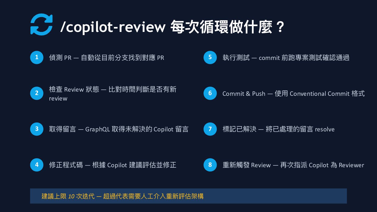 支 找到對應 PR 2 檢查 Review 狀態 — 比對時間判斷是否有新 review 3 取得留 言 — GraphQL 取得未解決的 Copilot 留 言 4 修正程式碼 — 根據 Copilot 建議評估並修正 5 執 行 測試 — commit 前跑專案測試確認通過 6 Commit & Push — 使 用 Conventional Commit 格式 7 標記已解決 — 將已處理的留 言 resolve 8 重新觸發 Review — 再次指派 Copilot 為 Reviewer 建議上限 10 次迭代 — 超過代表需要 人工 介入重新評估架構
