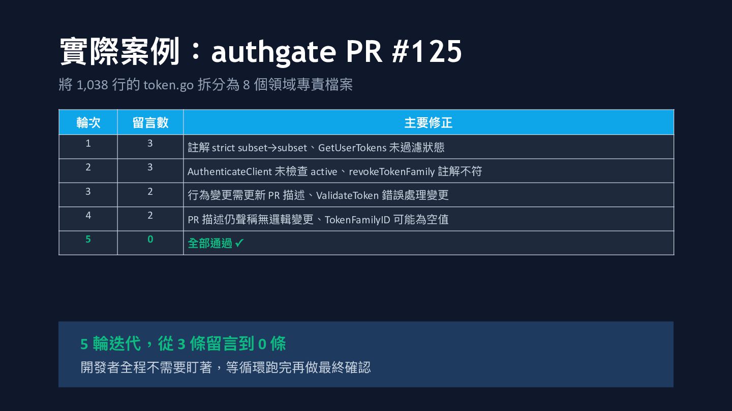 個領域專責檔案 輪次 留 言 數 主要修正 1 3 註解 strict subset→subset、GetUserTokens 未過濾狀態 2 3 AuthenticateClient 未檢查 active、revokeTokenFamily 註解不符 3 2 行 為變更需更新 PR 描述、ValidateToken 錯誤處理變更 4 2 PR 描述仍聲稱無邏輯變更、TokenFamilyID 可能為空值 5 0 全部通過 ✓ 5 輪迭代,從 3 條留 言 到 0 條 開發者全程不需要盯著,等循環跑完再做最終確認