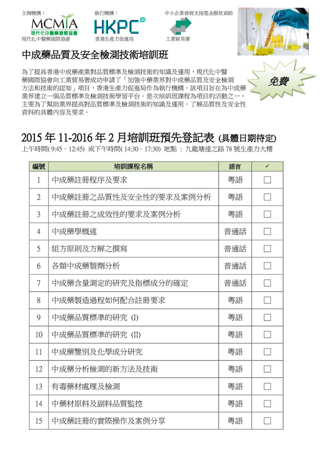 [email protected] 注意事項: - 以上活動均以持有中成藥製造商牌照的公司和持有中成藥批發商及零售商牌照的公司代表優先安排考 慮,名額有限,先到先得。 - 主辦單位將保留最終安排權力。 - 一旦成功報名參加培訓的人員務必參加培訓,否則將不能再報名參加該項目的其他培訓。 - 查詢,請致電香港生產力促進局 羅先生 2788 5651。 公司名稱 所屬協會 地址 傳真 業務性質 中成藥製造商或 零售商牌照牌照 姓名 (1) 直線 手機 職位 姓名 (2) 直線 手機 職位 姓名 (3) 直線 手機 職位 電郵 *必填 (將以電郵回覆確認) (1) (2) (3) 支持單位: (排名不分先後) 香港中成藥商會 港九中華藥業商會 香港藥行商 國際中醫中藥總會 香港中藥學會 香港南北藥行以義堂商會 香港參茸藥材寶壽堂商會 香港中藥聯商會 香港中藥從業員協會 同意聲明 : 閣下提供之個人資料(包括姓名、聯絡電話、傳真號碼、通訊地址和電郵地址)將會用於處理、評估和管理閣下登記出席本活動之 用。閣下有權查閱及修正閣下就你的申請所提供的個人資料。如有需要,請發電郵至