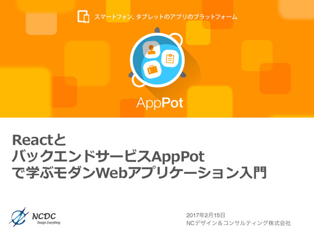 rights reserved. 依存しているライブラリ "dependencies": { "apppot-sdk": "^2.3.5", "bootstrap": "^3.3.7", "es6-promise": "^4.0.5", "moment": "^2.17.1", "react": "^15.3.2", "react-dom": "^15.3.2", "react-modal": "^1.6.5", "react-router": "^3.0.2" }, "devDependencies": { "babel-preset-es2015": "^6.22.0", "babel-preset-react": "^6.16.0", "babelify": "^7.3.0", "browserify": "^13.1.0", "http-server": "^0.9.0" } package.json アプリの動作に必要なライブラリ アプリの開発に必要なライブラリ