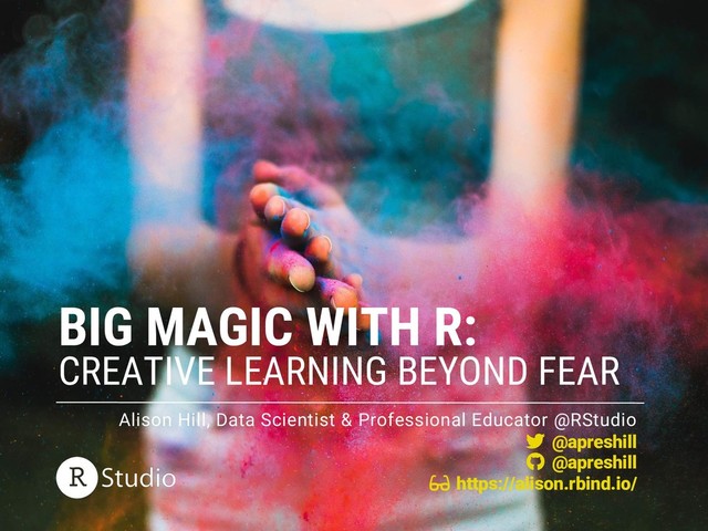 You will need this: http://happygitwithr.com • Your own website – My recommendation (obvious, biased): use blogdown – You will need this: https://bookdown.org/yihui/blogdown/ • A friend! – Make sure someone else ! at your code! – Ideas: • Partner up with someone in your team / lab / company • Find a coding partner at your local R Meet-up or R-Ladies group • Ask the #rstats twitterverse!
