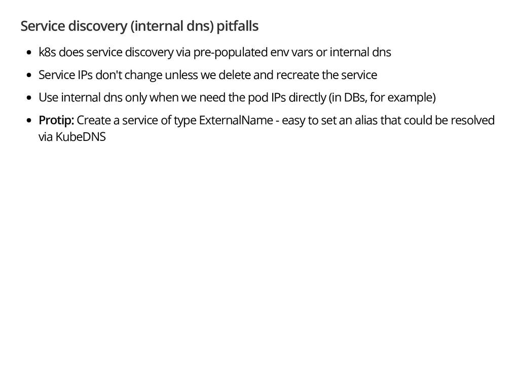 pre-populated env vars or internal dns Service IPs don't change unless we delete and recreate the service Use internal dns only when we need the pod IPs directly (in DBs, for example) Protip: Create a service of type ExternalName - easy to set an alias that could be resolved via KubeDNS