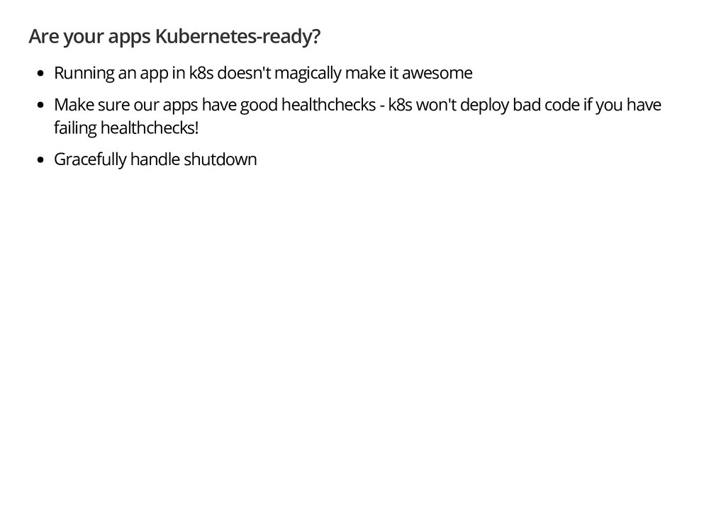 magically make it awesome Make sure our apps have good healthchecks - k8s won't deploy bad code if you have failing healthchecks! Gracefully handle shutdown