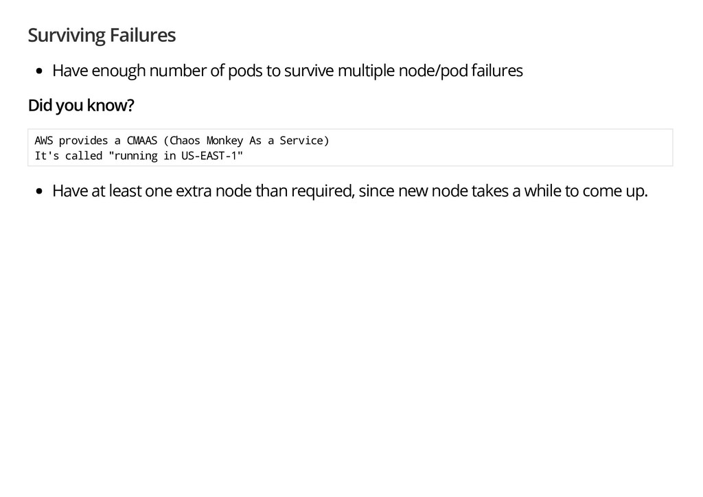 node/pod failures Did you know? AWS provides a CMAAS (Chaos Monkey As a Service) It's called "running in US-EAST-1" Have at least one extra node than required, since new node takes a while to come up.