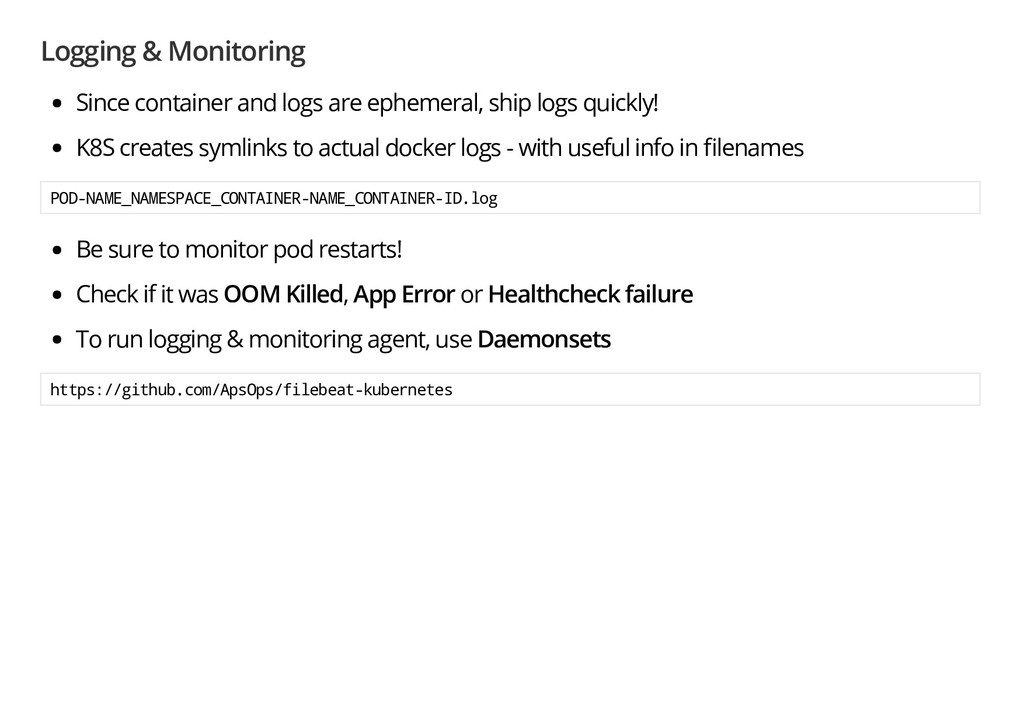 logs quickly! K8S creates symlinks to actual docker logs - with useful info in lenames POD-NAME_NAMESPACE_CONTAINER-NAME_CONTAINER-ID.log Be sure to monitor pod restarts! Check if it was OOM Killed, App Error or Healthcheck failure To run logging & monitoring agent, use Daemonsets https://github.com/ApsOps/filebeat-kubernetes