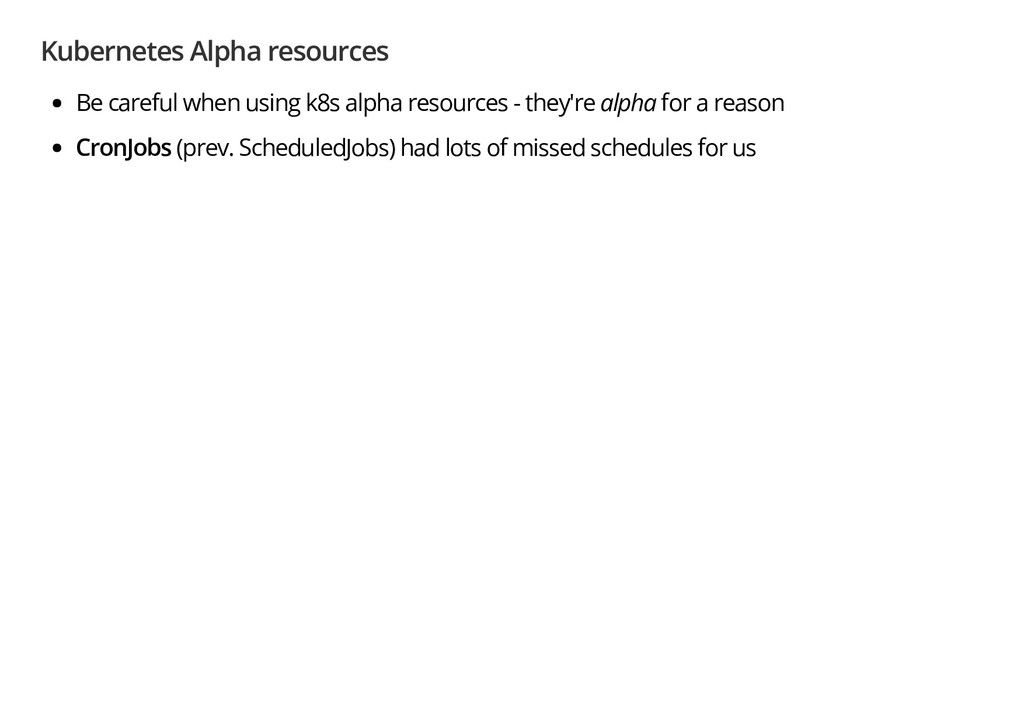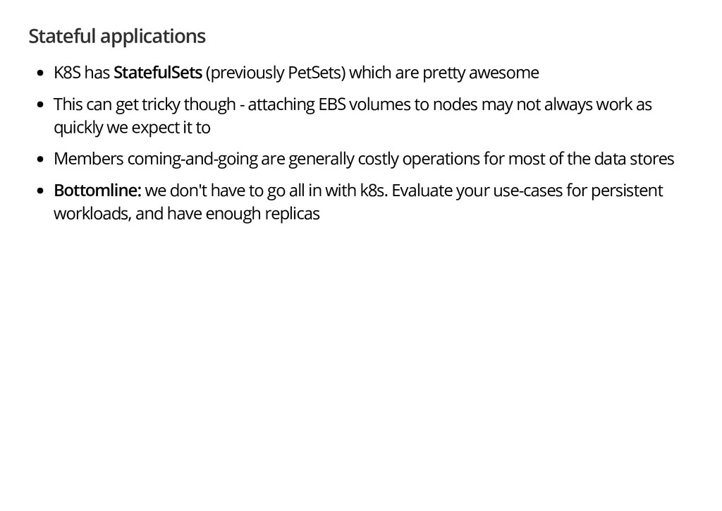 awesome This can get tricky though - attaching EBS volumes to nodes may not always work as quickly we expect it to Members coming-and-going are generally costly operations for most of the data stores Bottomline: we don't have to go all in with k8s. Evaluate your use-cases for persistent workloads, and have enough replicas