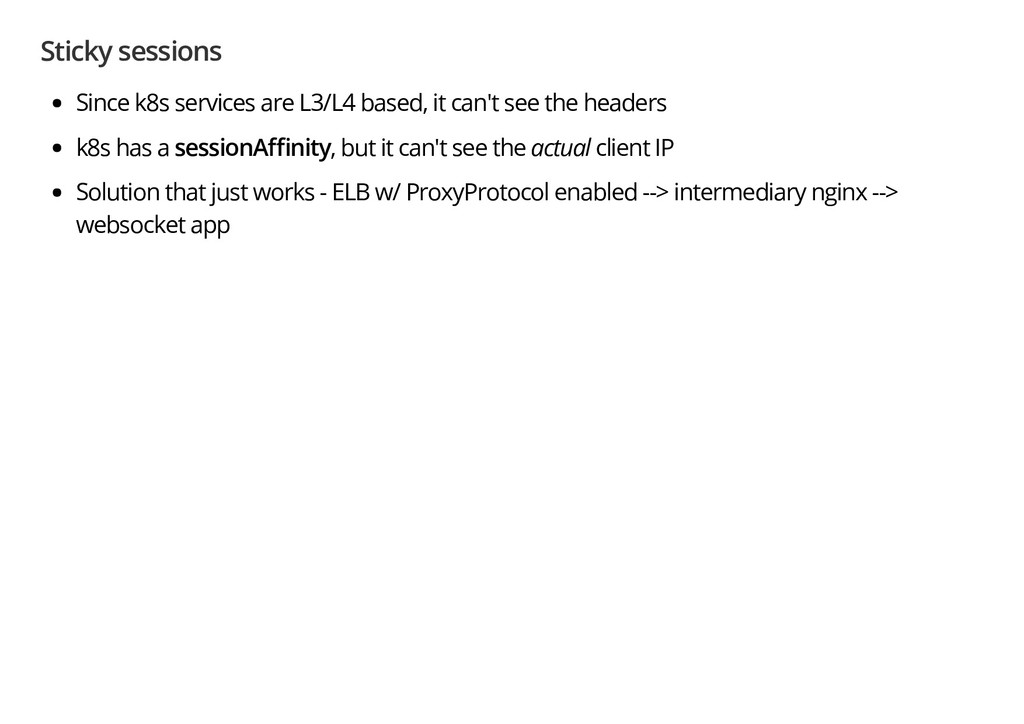 see the headers k8s has a sessionA nity, but it can't see the actual client IP Solution that just works - ELB w/ ProxyProtocol enabled --> intermediary nginx --> websocket app