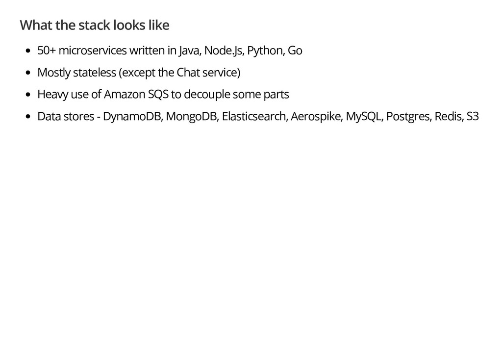 Node.Js, Python, Go Mostly stateless (except the Chat service) Heavy use of Amazon SQS to decouple some parts Data stores - DynamoDB, MongoDB, Elasticsearch, Aerospike, MySQL, Postgres, Redis, S3