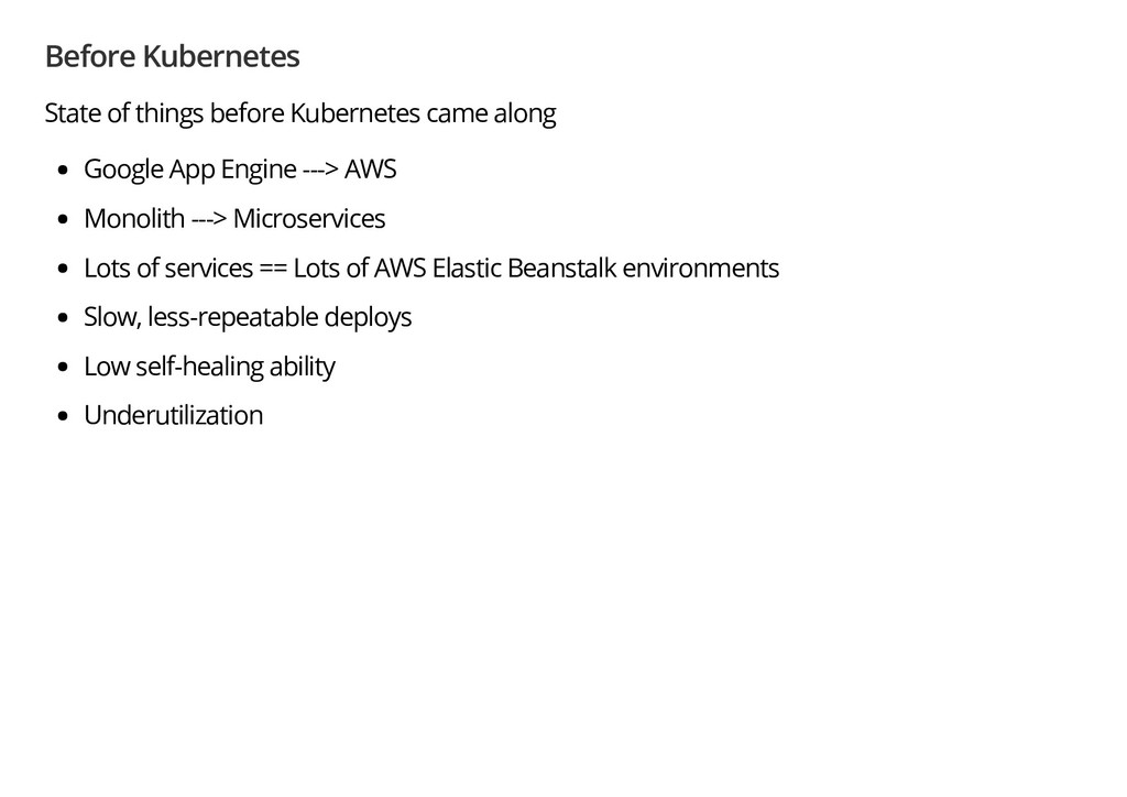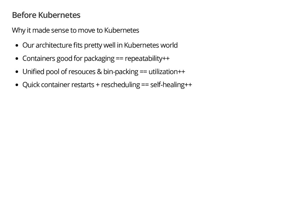 Our architecture ts pretty well in Kubernetes world Containers good for packaging == repeatability++ Uni ed pool of resouces & bin-packing == utilization++ Quick container restarts + rescheduling == self-healing++