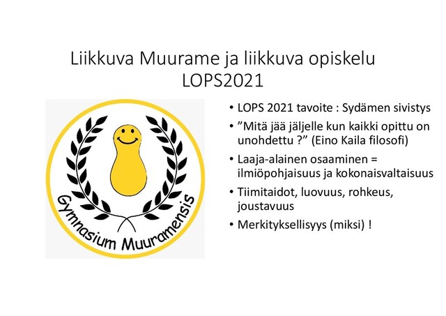 : Sydämen sivistys • ”Mitä jää jäljelle kun kaikki opittu on unohdettu ?” (Eino Kaila filosofi) • Laaja-alainen osaaminen = ilmiöpohjaisuus ja kokonaisvaltaisuus • Tiimitaidot, luovuus, rohkeus, joustavuus • Merkityksellisyys (miksi) !