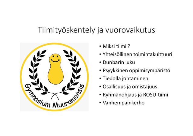 opettajainkokouksissa • Liikuntatutorit isossa roolissa • Tiimioppiminen ja tiimisopimus sitouttamisen välineenä • Alumneihin pidetään yhteyttä / työelämäpäivä ja alumnipäivä