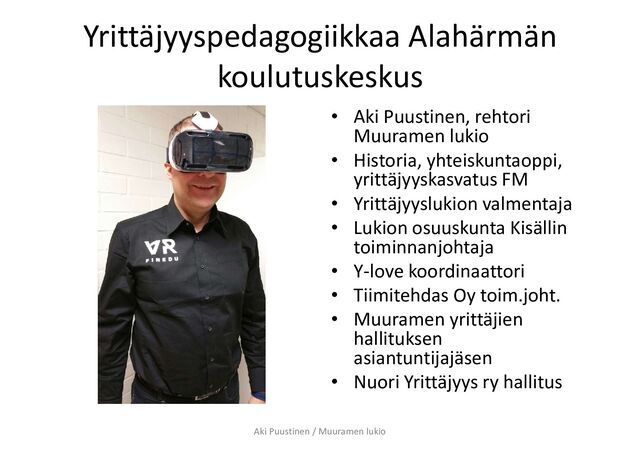 Historia, yhteiskuntaoppi, yrittäjyyskasvatus FM • Yrittäjyyslukion valmentaja • Lukion osuuskunta Kisällin toiminnanjohtaja • Y-love koordinaattori • Tiimitehdas Oy toim.joht. • Muuramen yrittäjien hallituksen asiantuntijajäsen • Nuori Yrittäjyys ry hallitus Aki Puustinen / Muuramen lukio