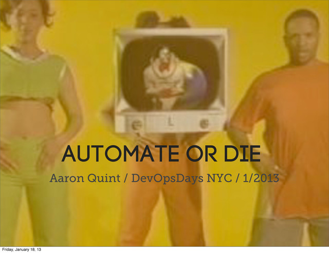 ~2 million • Registered user growth over December 2011: 211% (3.1x) • Revenue growth over December 2011: 135% (2.3x) • Number of commits to main app git repo: 44,545 • Number of commits to chef git repo: 4,447 • Peak traffic served: ~300 Mbps • Number of production deploys across applications: 1,631 • Number of staging deploys across applications: 10,600 • Unique animated gifs posted in Campfire: 3,208 Friday, January 18, 13