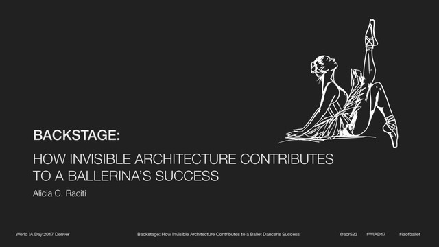 This invisible architecture has worked so well for the dancers and companies, that it has been applied to all 6 major ballet methods used throughout the world. We will examine the architecture, how it contributes to the success of the dancers, and what we as UX designers can learn from it.