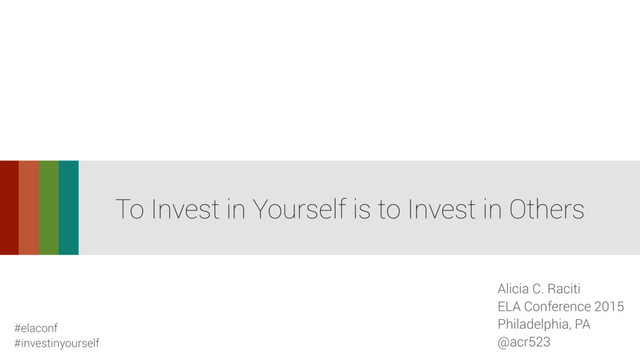 To invest in yourself is to invest in others. In a world that is pre-occupied in getting ahead and contributing to a community, we often find ourselves at a critical breaking point when it is too often too late. We put time into cultivating our work, relationships with others, and our families, but what about investing time in ourselves? Focusing on self-care is not a once and done deal. It is something that needs to become part of your routine whether it be daily, weekly, or monthly. This talk will examine and share various ways to help avoid burnout and solutions on how to make self-care part of your regular routine.