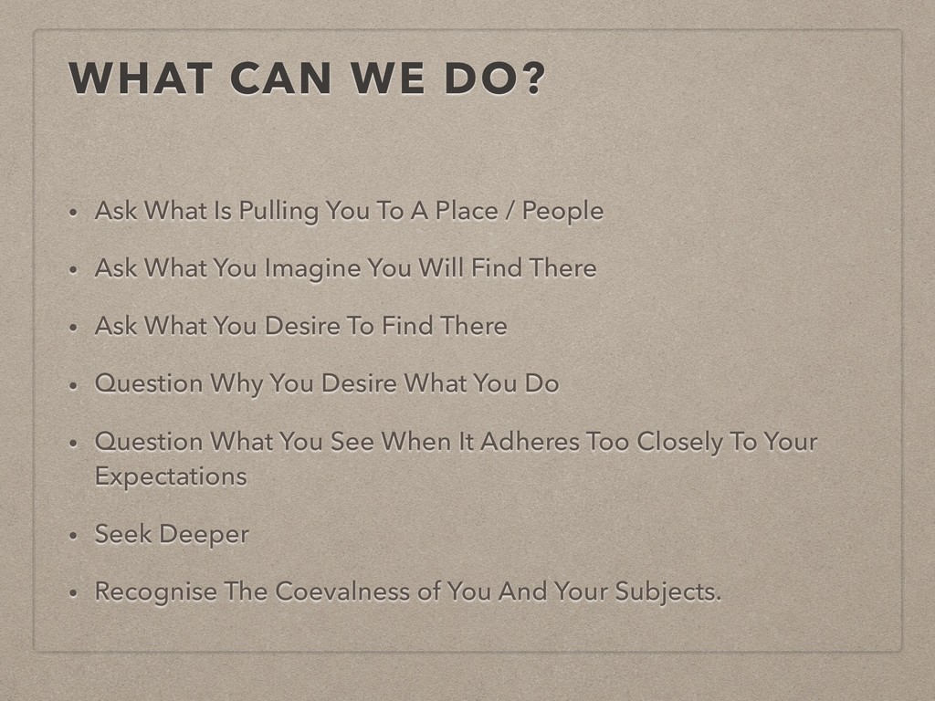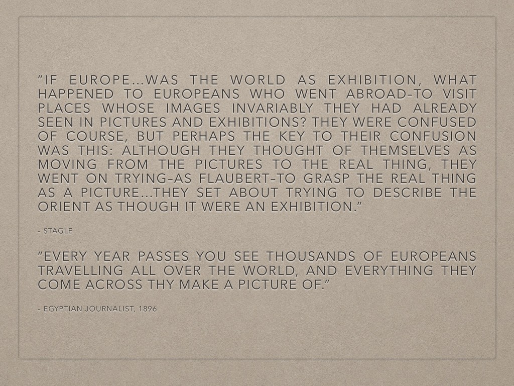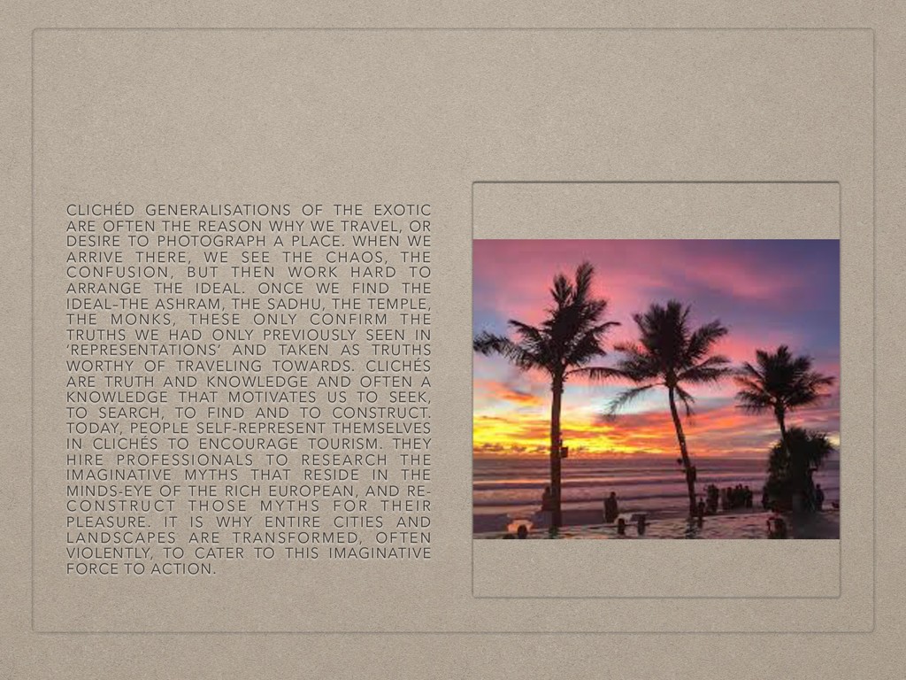 WE TRAVEL, OR DESIRE TO PHOTOGRAPH A PLACE. WHEN WE ARRIVE THERE, WE SEE THE CHAOS, THE CONFUSION, BUT THEN WORK HARD TO ARRANGE THE IDEAL. ONCE WE FIND THE IDEAL–THE ASHRAM, THE SADHU, THE TEMPLE, THE MONKS, THESE ONLY CONFIRM THE TRUTHS WE HAD ONLY PREVIOUSLY SEEN IN ‘REPRESENTATIONS’ AND TAKEN AS TRUTHS WORTHY OF TRAVELING TOWARDS. CLICHÉS ARE TRUTH AND KNOWLEDGE AND OFTEN A KNOWLEDGE THAT MOTIVATES US TO SEEK, TO SEARCH, TO FIND AND TO CONSTRUCT. TODAY, PEOPLE SELF-REPRESENT THEMSELVES IN CLICHÉS TO ENCOURAGE TOURISM. THEY HIRE PROFESSIONALS TO RESEARCH THE IMAGINATIVE MYTHS THAT RESIDE IN THE MINDS-EYE OF THE RICH EUROPEAN, AND RE- C O N S T R U C T T H O S E M Y T H S F O R T H E I R PLEASURE. IT IS WHY ENTIRE CITIES AND LANDSCAPES ARE TRANSFORMED, OFTEN VIOLENTLY, TO CATER TO THIS IMAGINATIVE FORCE TO ACTION.
